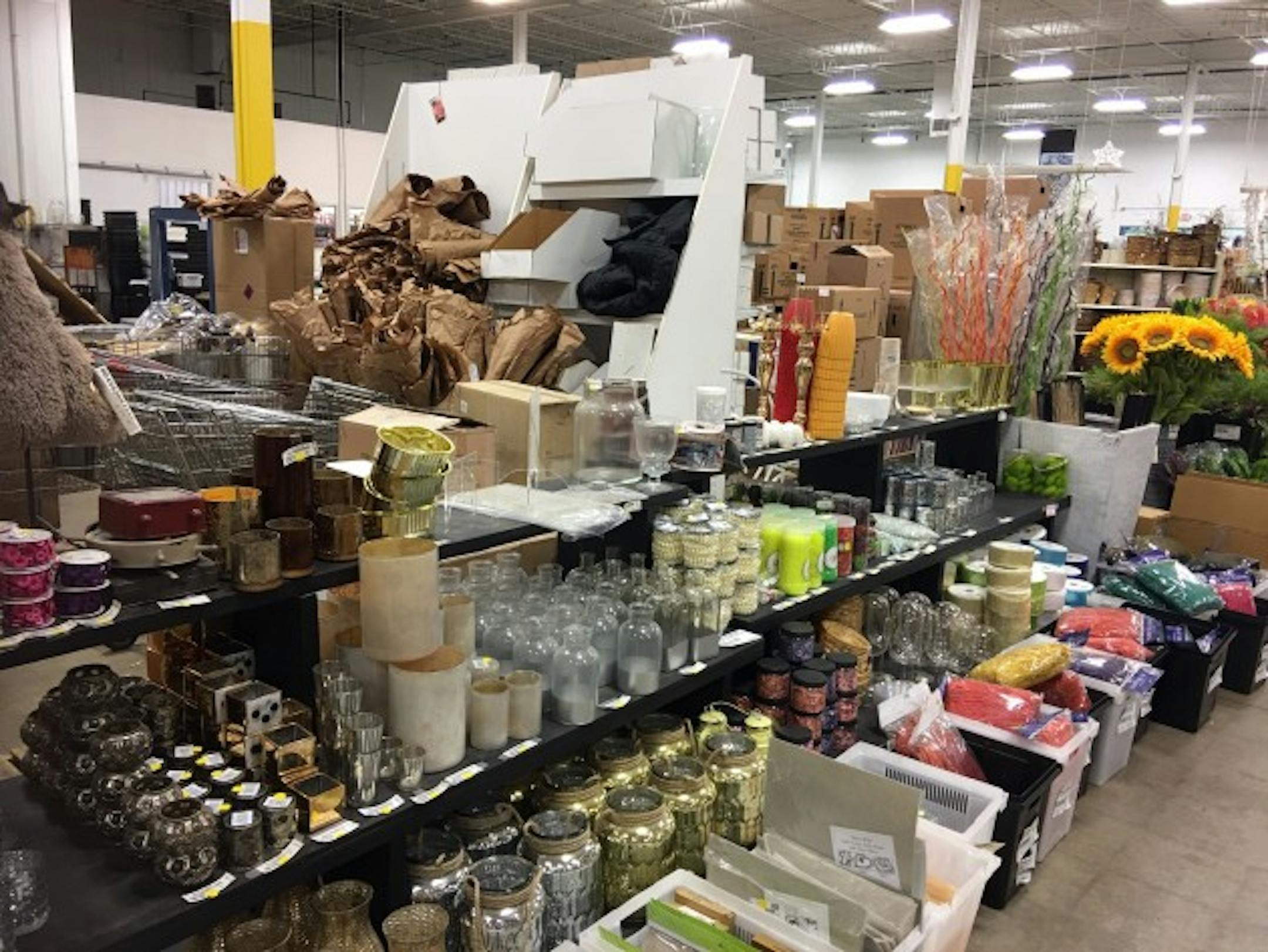 The selection includes votive holders, vases, raffia, ribbon, candelabras, pedestals, urns, silk flowers, glassware, holiday decor, and candles at 50-75% off. Live flowers and plants are not included in the sale. All merchandise is new,