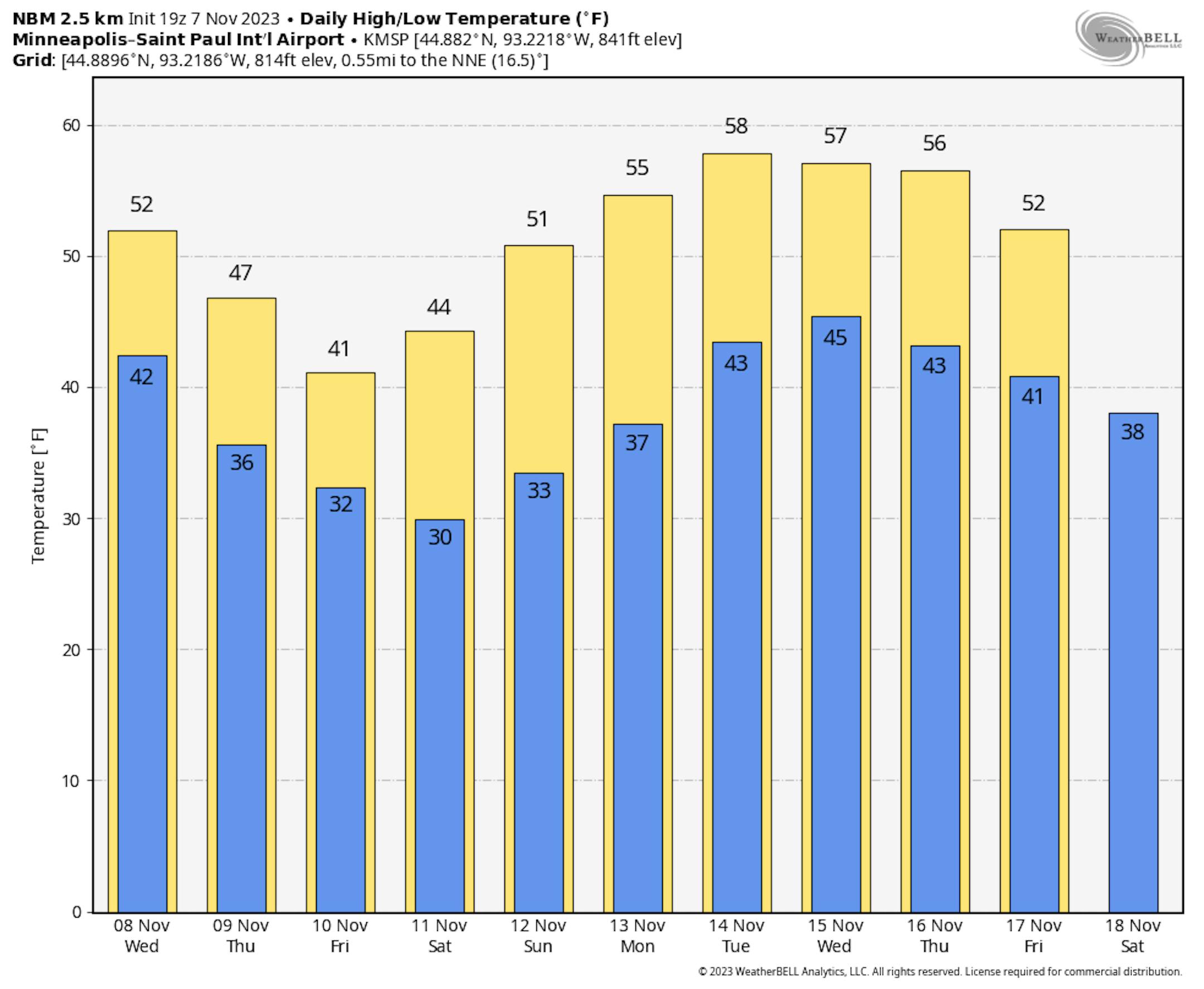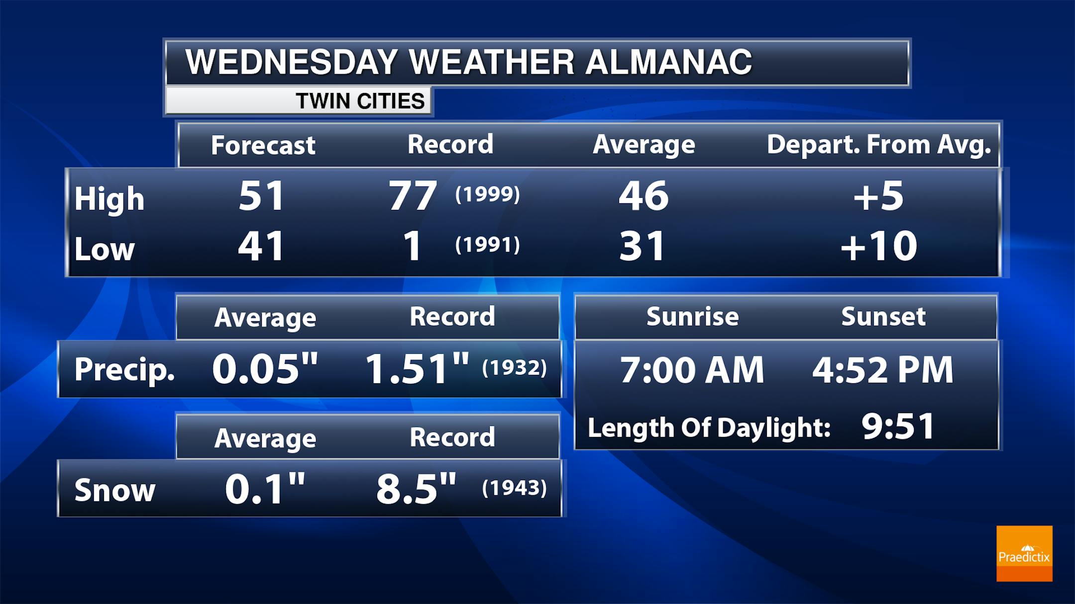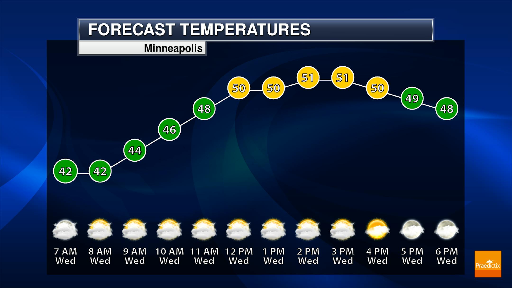 The weather outlook for the Twin Cities on Wednesday, November 8th will still be very warm for this time of the year with readings warming into the lower 50s. This will be nearly +5F to +10F above average for this time of the year. Skies will be cloudier throughout much of the day as well.