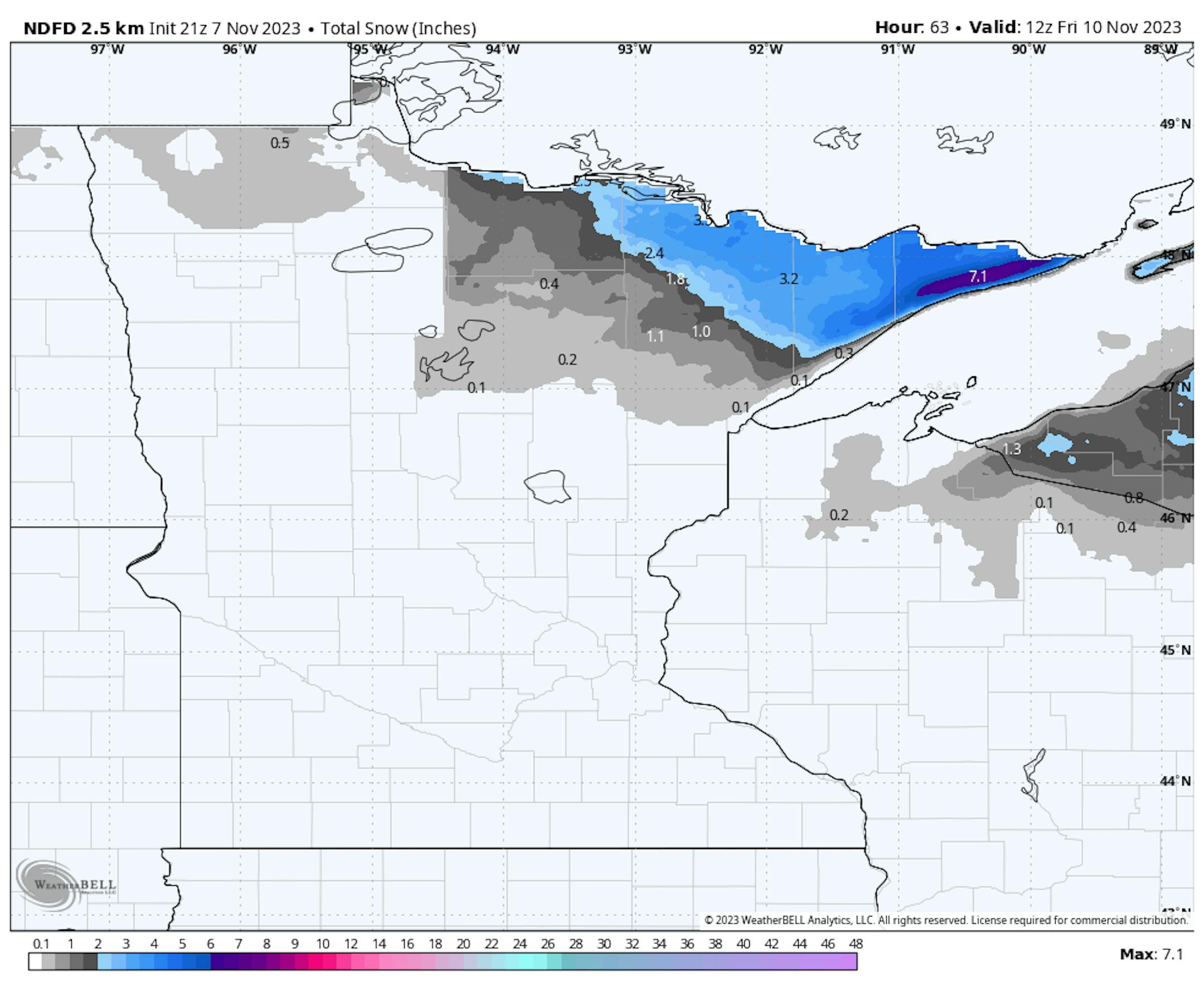 Here's the snowfall outlook through Thursday, which shows some minor accumulations across the Arrowhead. Some folks could be shoveling / plowing in those areas through midweek.