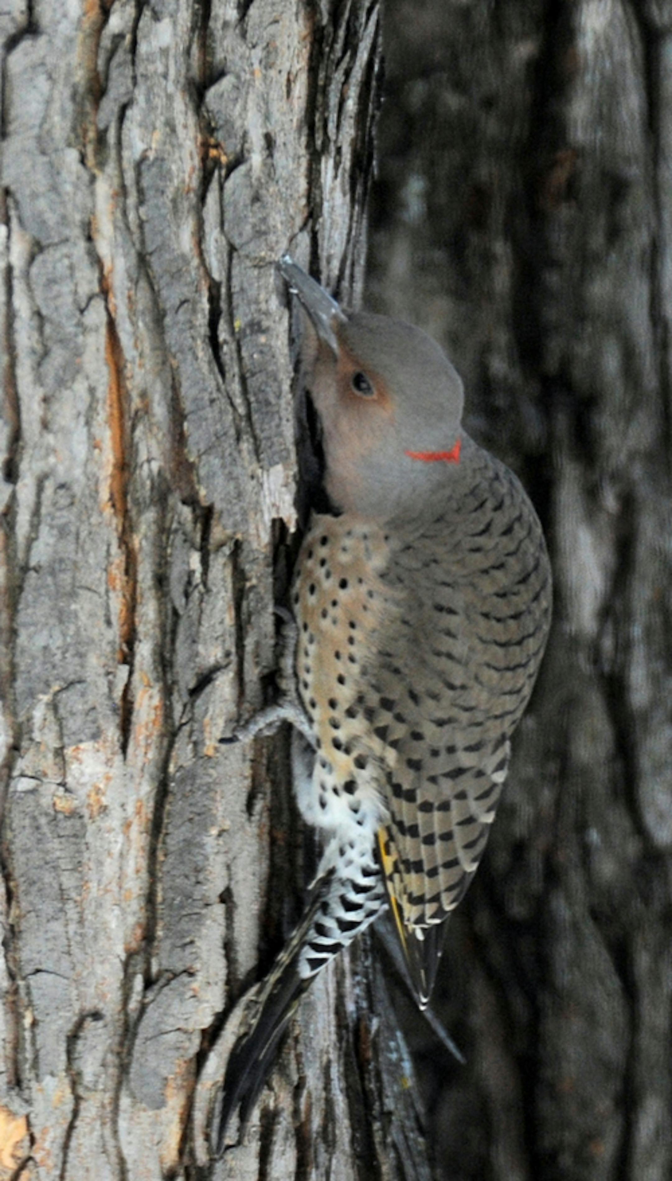 Flicker hunts beneath tree bark