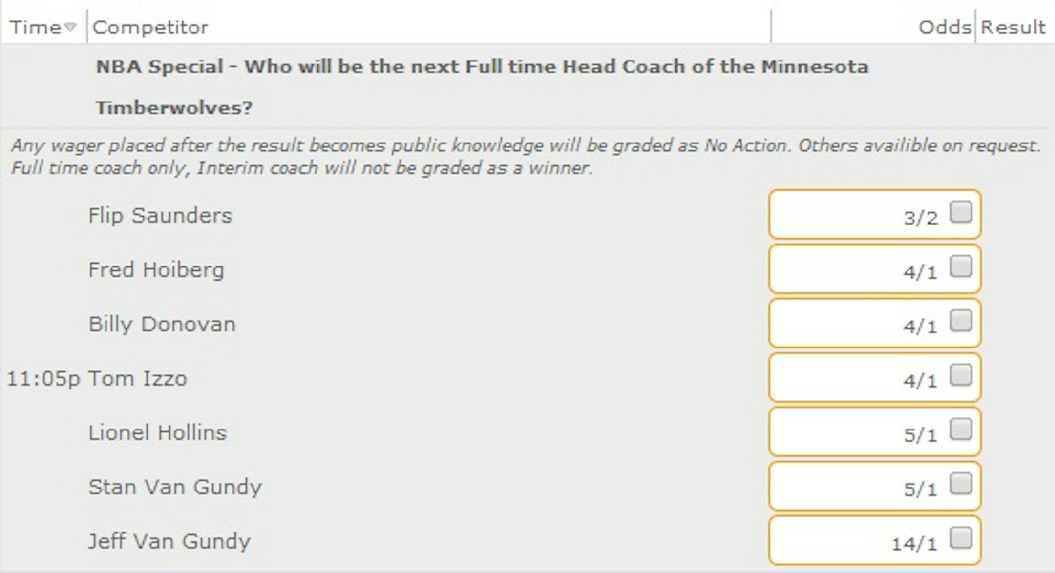 The sites asks potential bettors to wager on the next full-time Wolves coach and lists seven options. Flip, at 3-2 odds, is by far the favorite.
