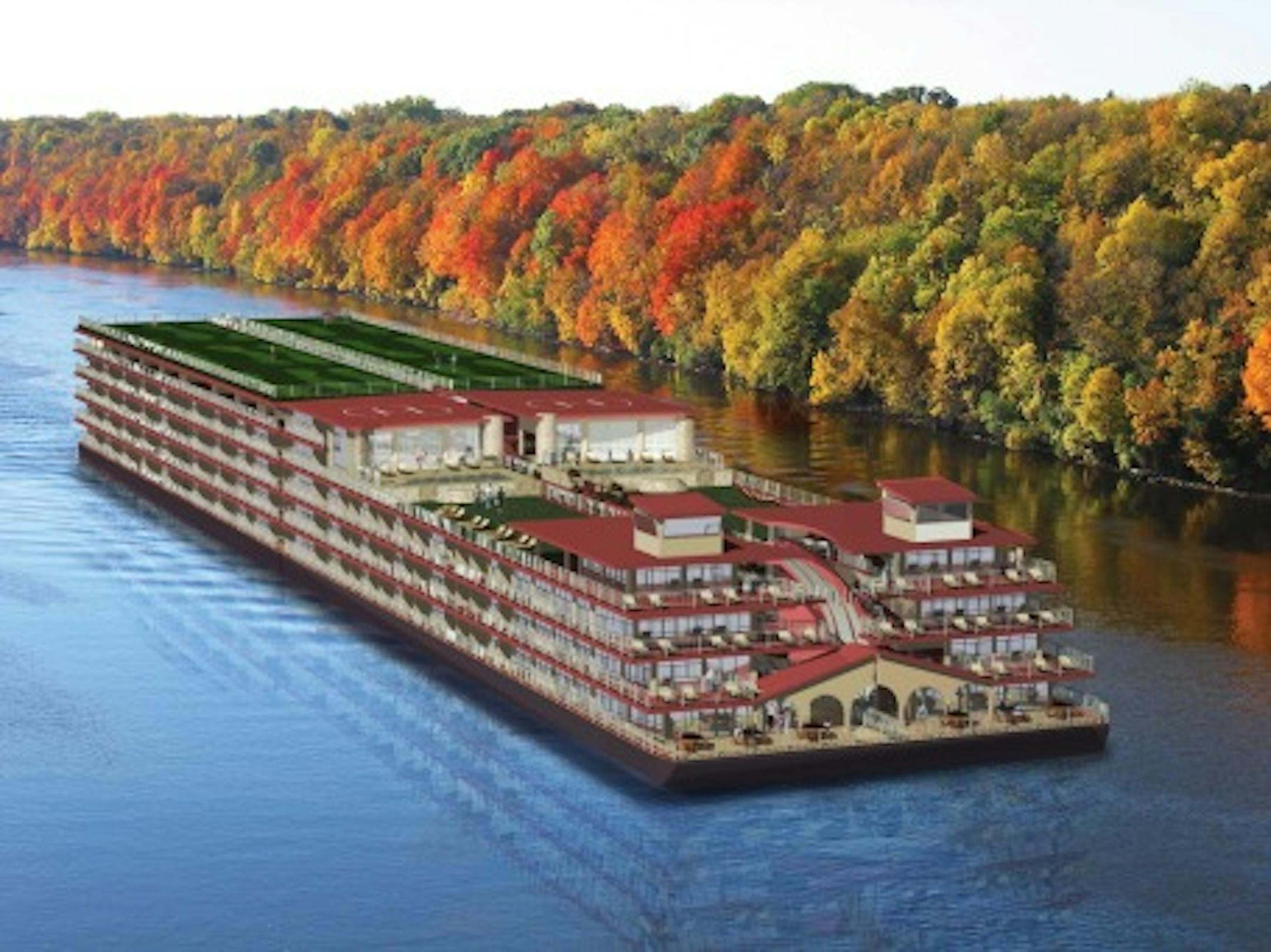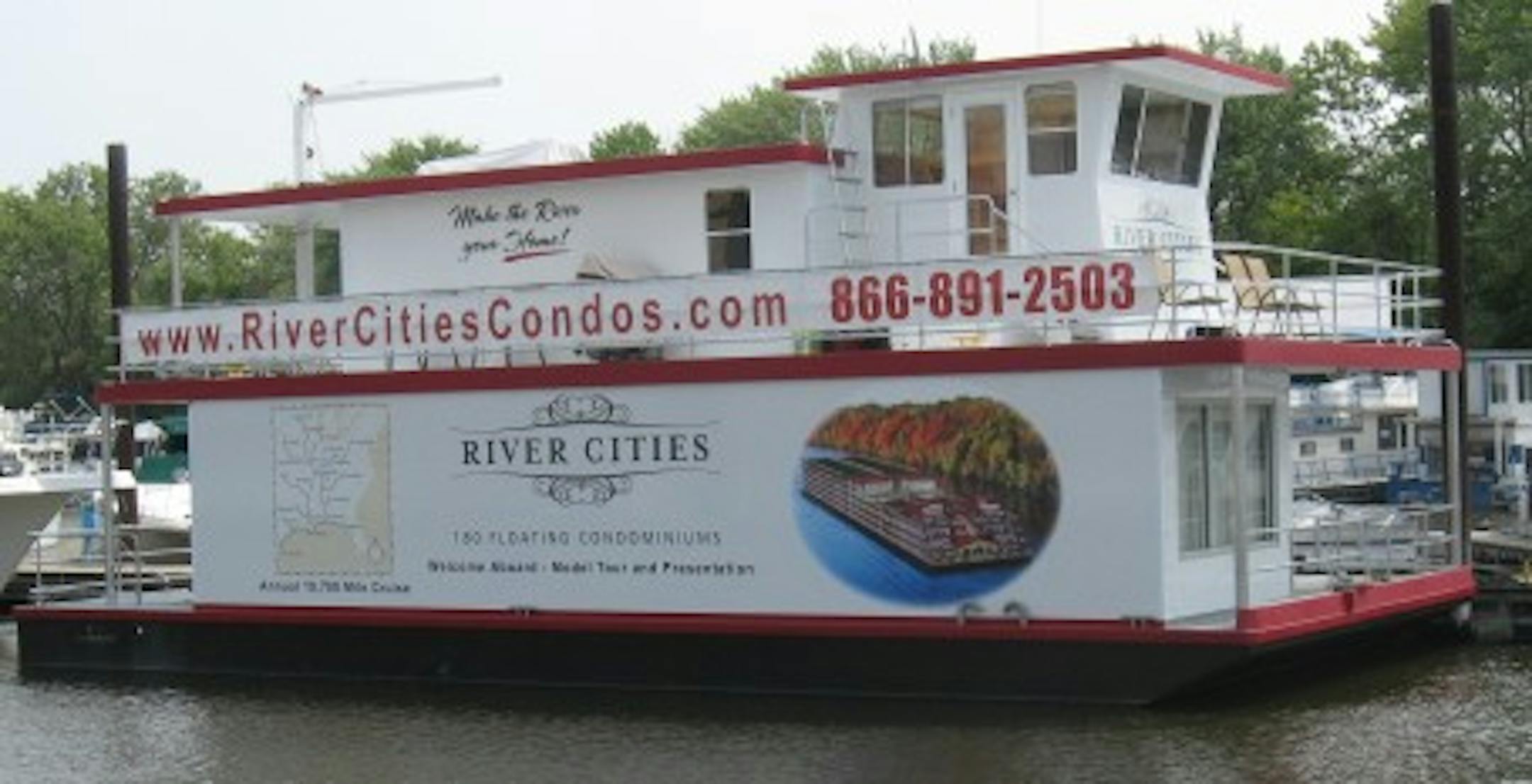 The condo market isn't particularly good right now, but if St. Paul developer, David Nelson, has his way, he's going to build a 180-unit floating condo community complete with two restaurants and a grocery that will ply the intercoastal waterways and rivers of the United States. He's trying to sell the units using various ownership models, including partial ownership. Prices range from $55,000 to $1.8 million with shared expenses ranging from $1,200 to $2,2000. per month, and that includes a fleet of cars and bikes that residents can use for shore excursions. He said that a one-bedroom unit will go for about $400,000, and the boats will cover more than 10,000 miles on all the major rivers of the U.S.