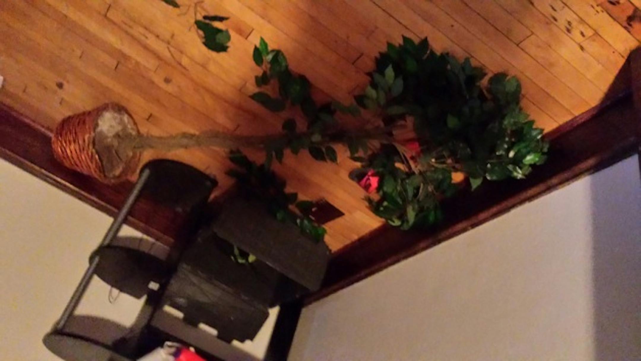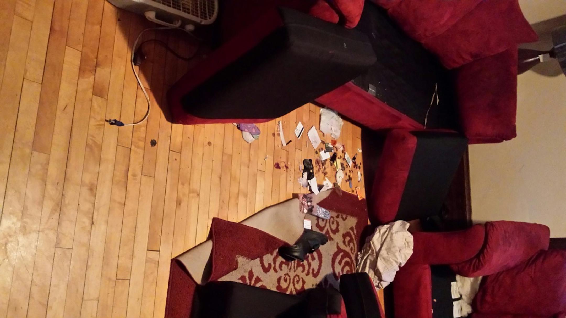 The pictures show evidence of a struggle, with a plant and furniture knocked over and two blood spots on the wood floor. Flowers was taken to Hennepin County Medical Center after the fight for treatment of cuts to his scalp and face. A Minneapolis police officer also required treatment for a bite wound, according to the police union.