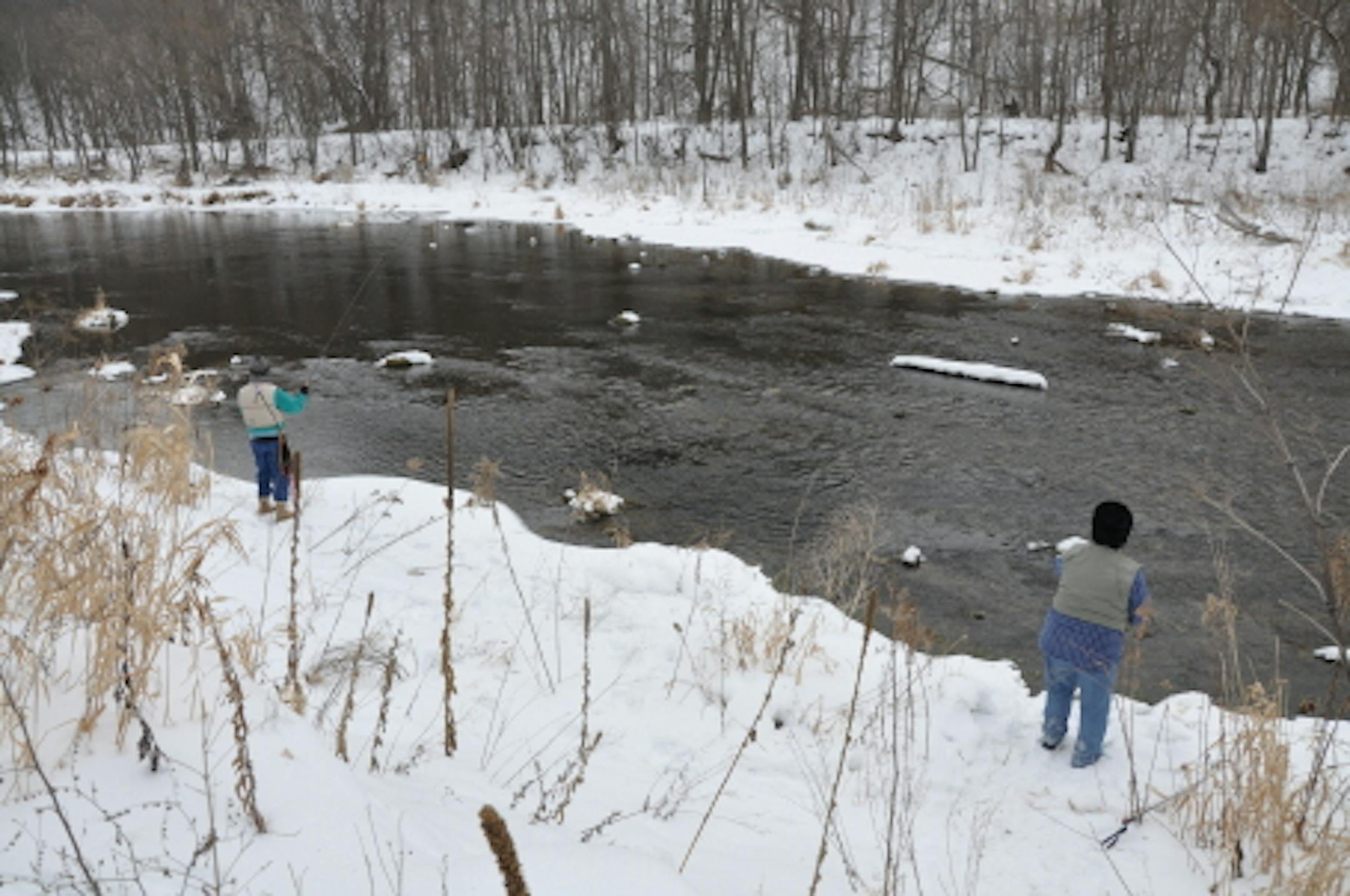 Fly fishing in 30 degree weather is perfect condition to rig up your gear and cast your lines for those elusive trout. Nymping off the bottom seems to work well and their bite is ever so subtle. An indicator is a must and any hesitation on the line...........set your hook.