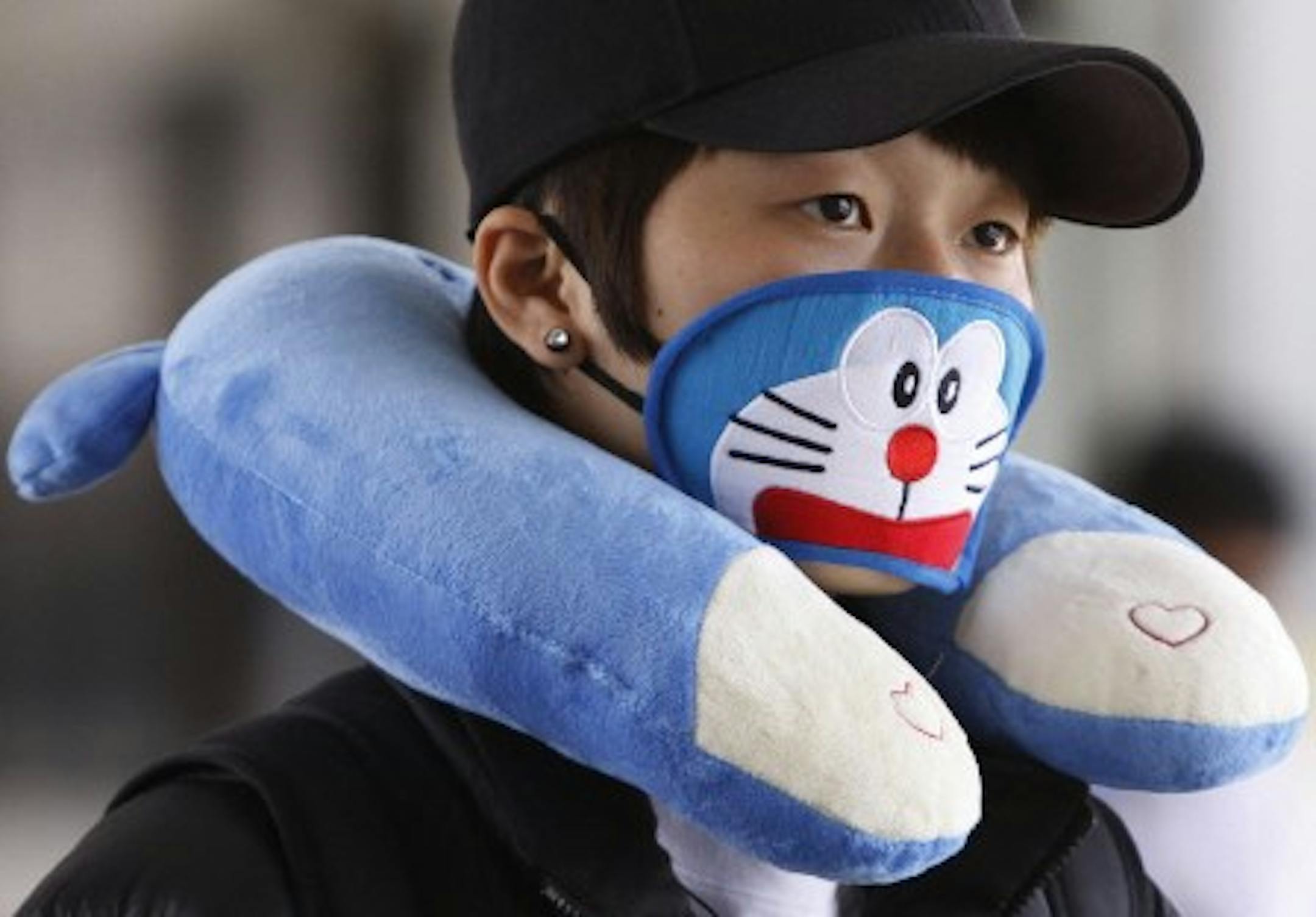 A passenger wears a mask featuring Japanese popular cartoon cat Doraemon, as she goes through thermal scanners, not shown, to detect symptoms of the Swine Flu at the arrival area of Manila's International Airport, Philippines. Photo by Associated Press