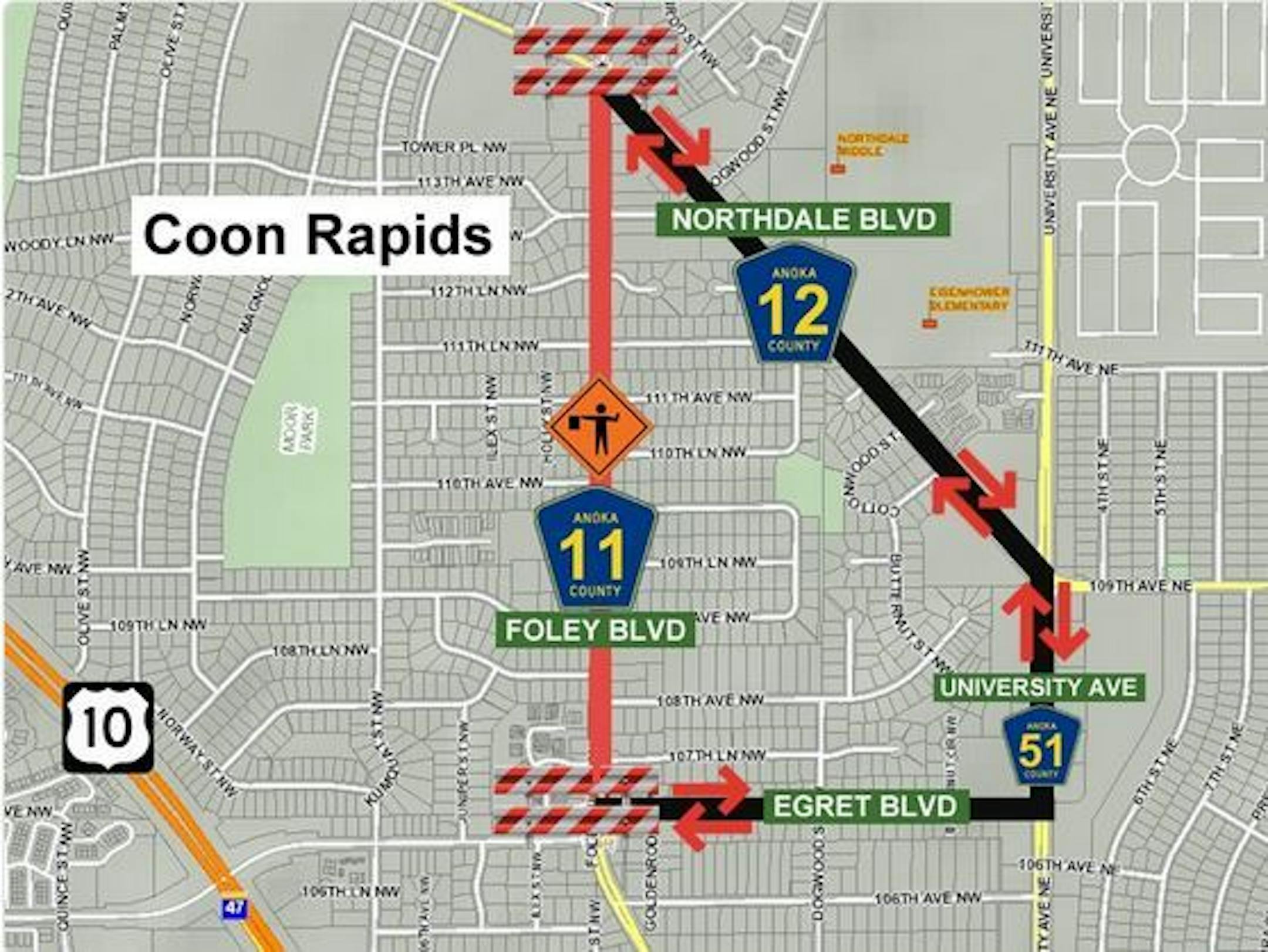Thousands of motorists who use Foley Boulevard in Coon Rapids will be on detour starting Tuesday, the Anoka County Transportation Department said.