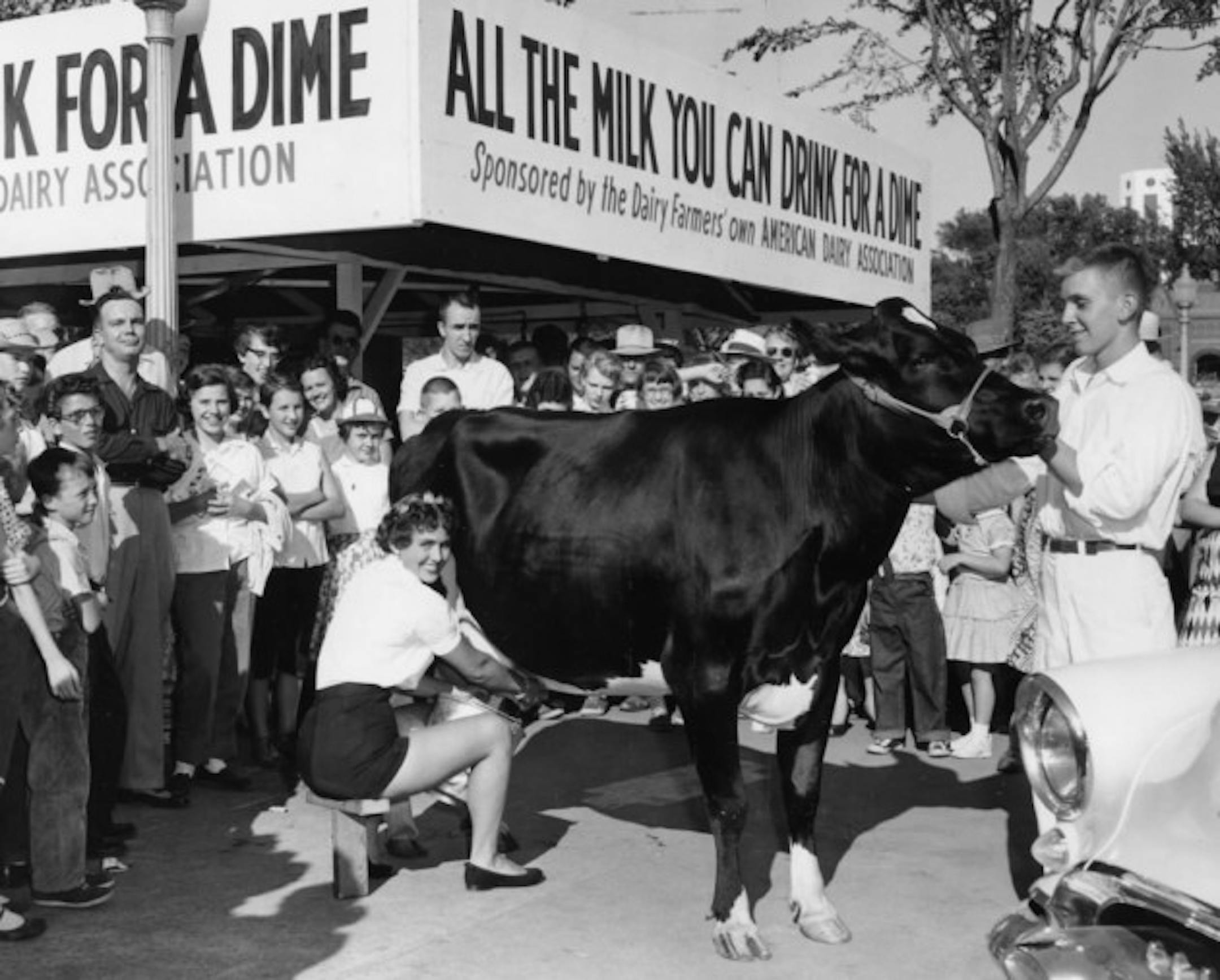 By the way, the above picture is also from the Strib archive. That's Ruth Marie Peterson of Austin, Minn., the 1955 Princess Kay of the Milky Way, milking Filco Ormsby Dainty Lady. They're in front of the all-you-can-drink milk booth. Note the price: 10 cents a glass. It's now a buck, and still one of the fair's best values.