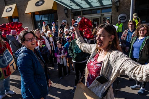 Armed with two dozen red balloons, the group marched down Lake Street singing songs in English and Spanish.