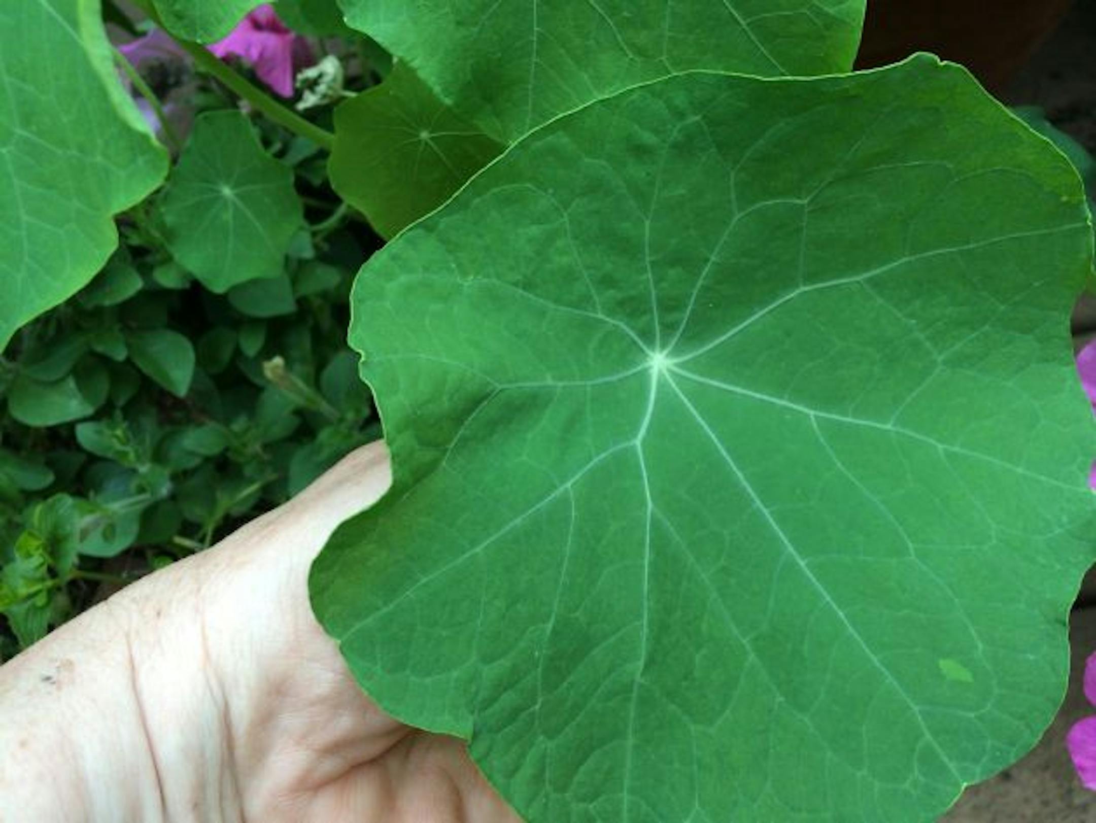 And my nasturtiums are bursting with blooms, plus sporting leaves as big as my hand. I grow them because I like the way they look in patio pots, but also because I love the peppery taste of the leaves and flowers in salads. It's time to toss one up!