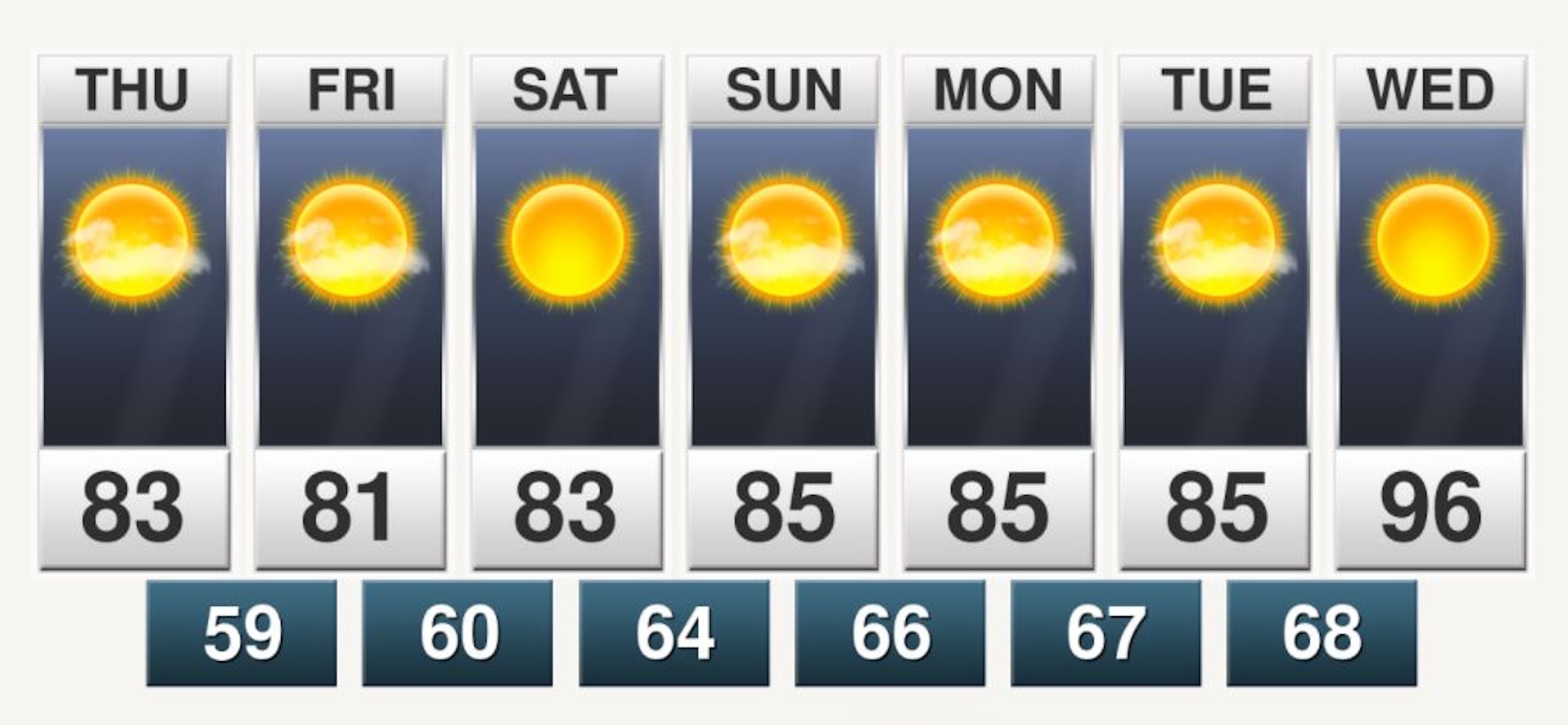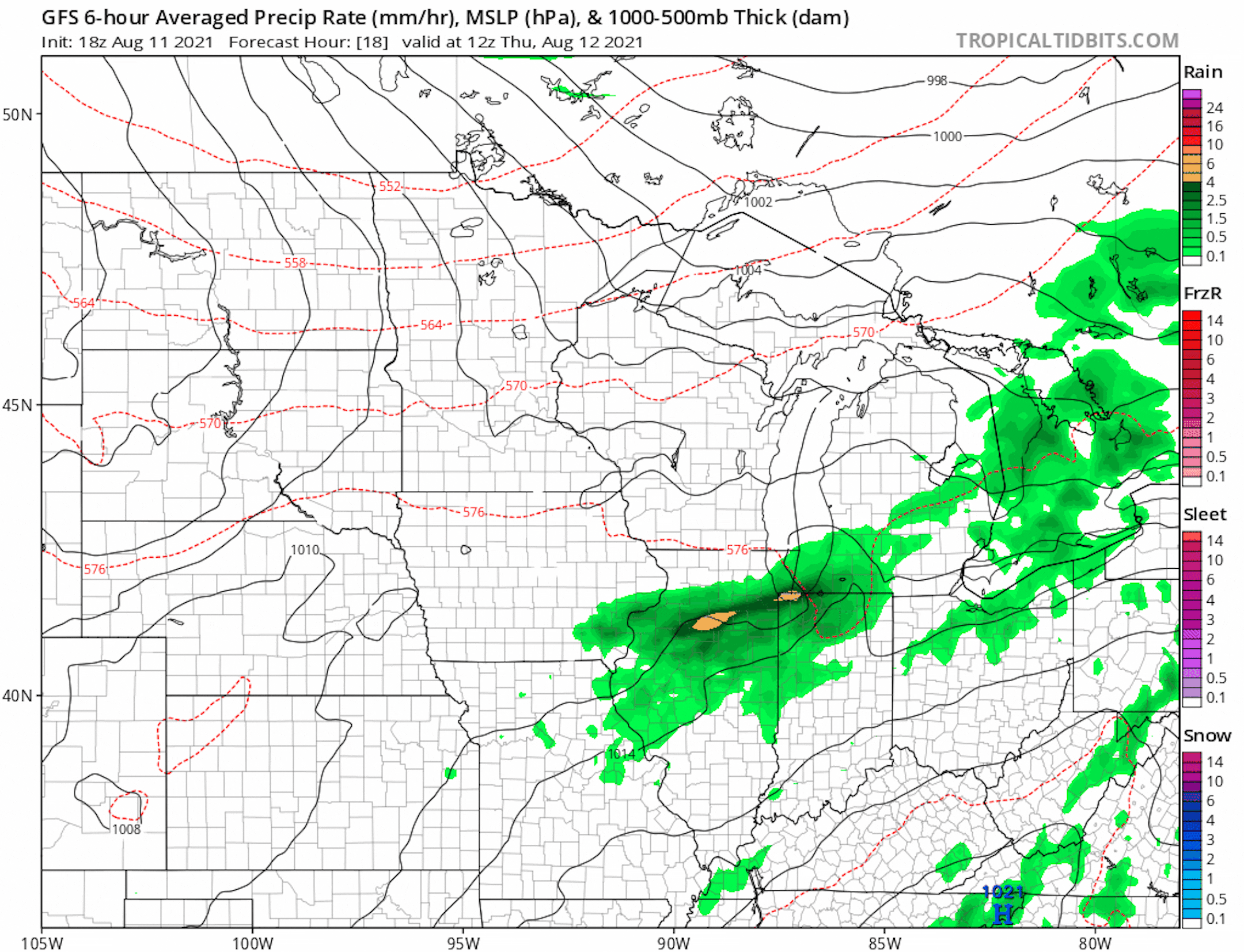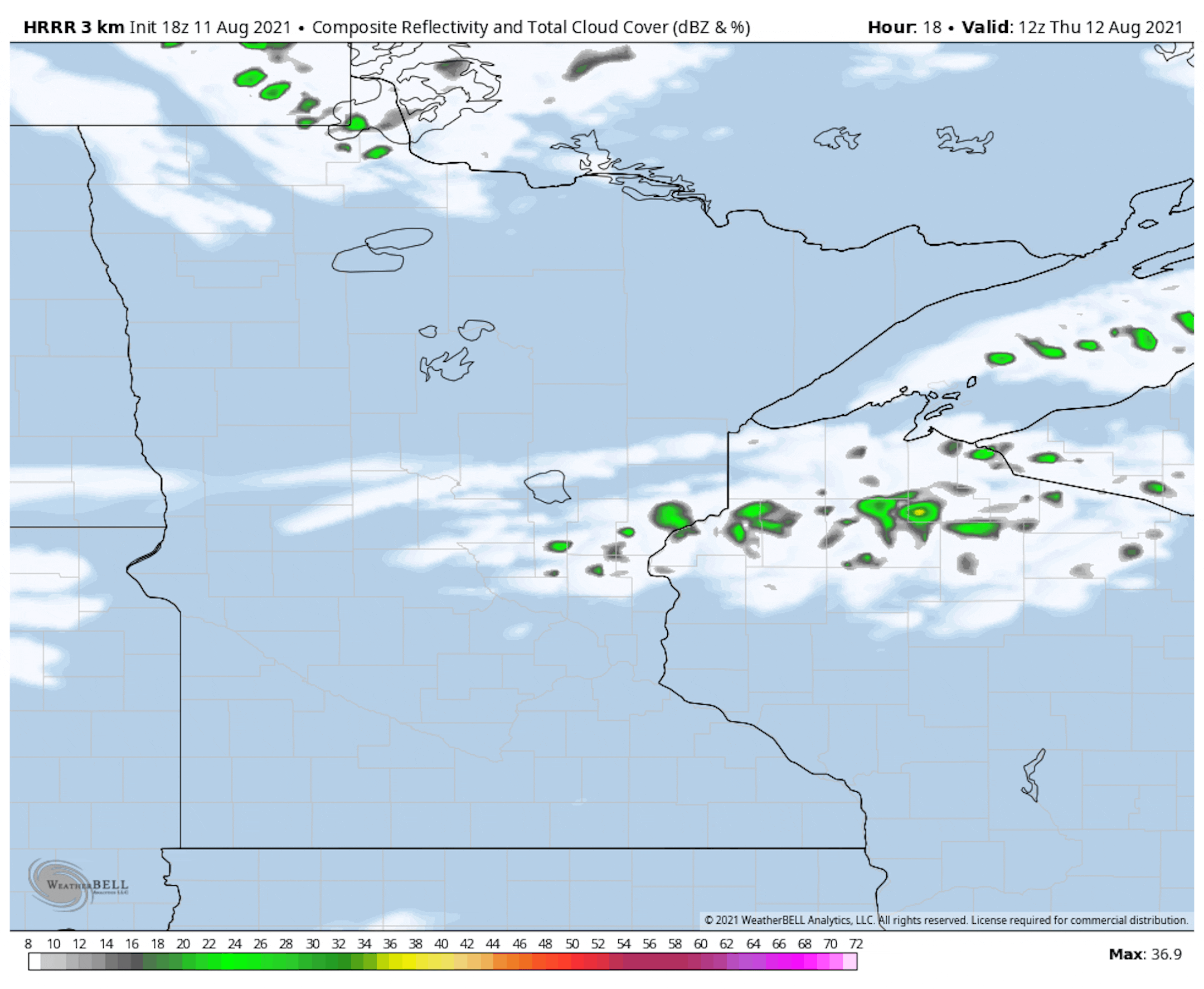 The HRRR Simulated Radar from midday Thursday to midday Friday shows a few clouds and spotty showers in place on Thursday, but most will stay dry. Friday will also be mostly sunny across the region with mild temps.