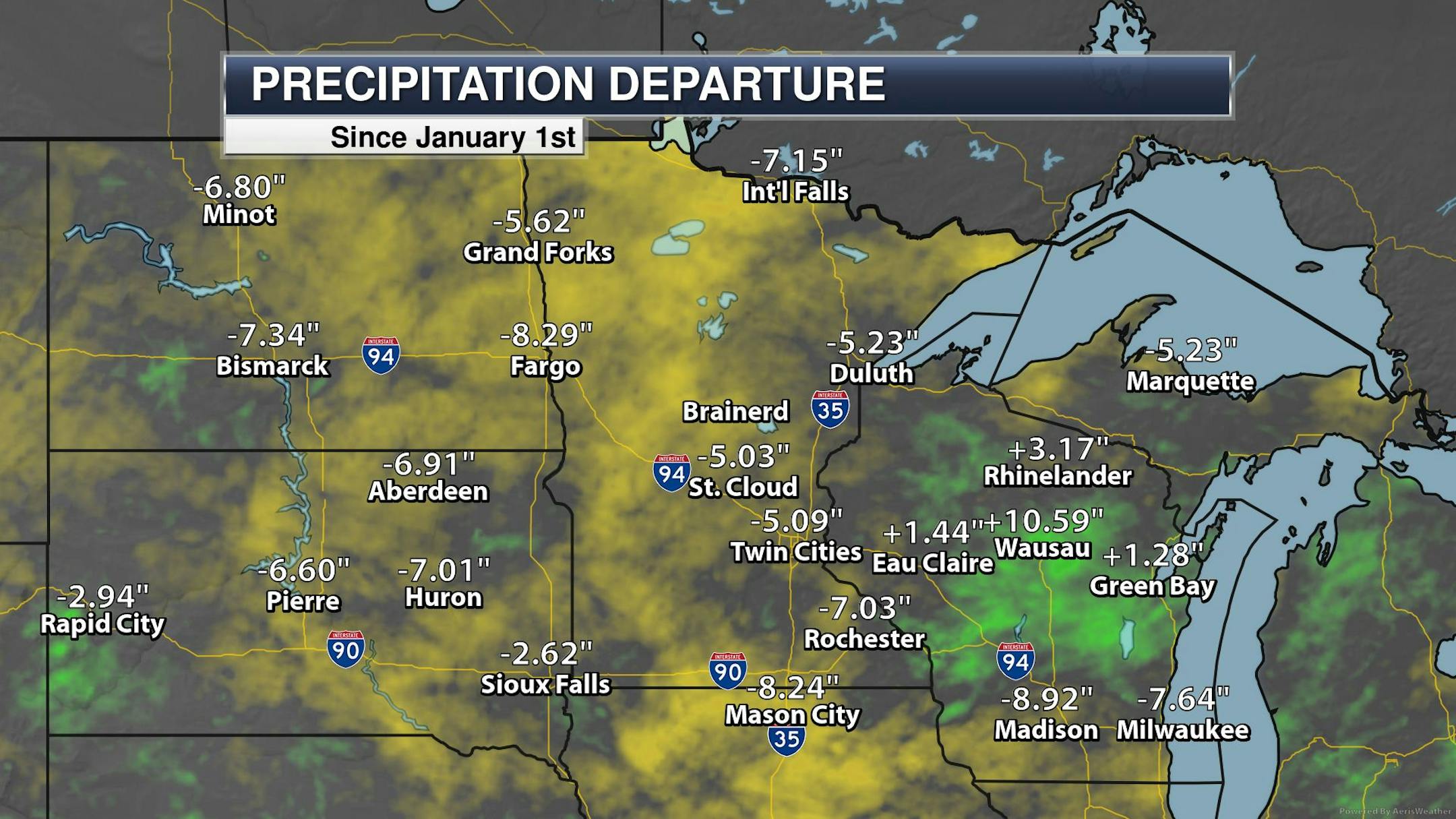 Even with last weekend's much needed rainfall, many locations across the region are still several inches below average precipitation from January 1st - August 10th. Minneapolis is still nearly -5.00" below average and at its 40th driest start to any year on record. Fargo was at the 6th driest and Milwaukee 18th driest. However, Wausau, WI is nearly +10.50" above average precipitation since January 1st, which is the 2nd wettest start to any year on record!