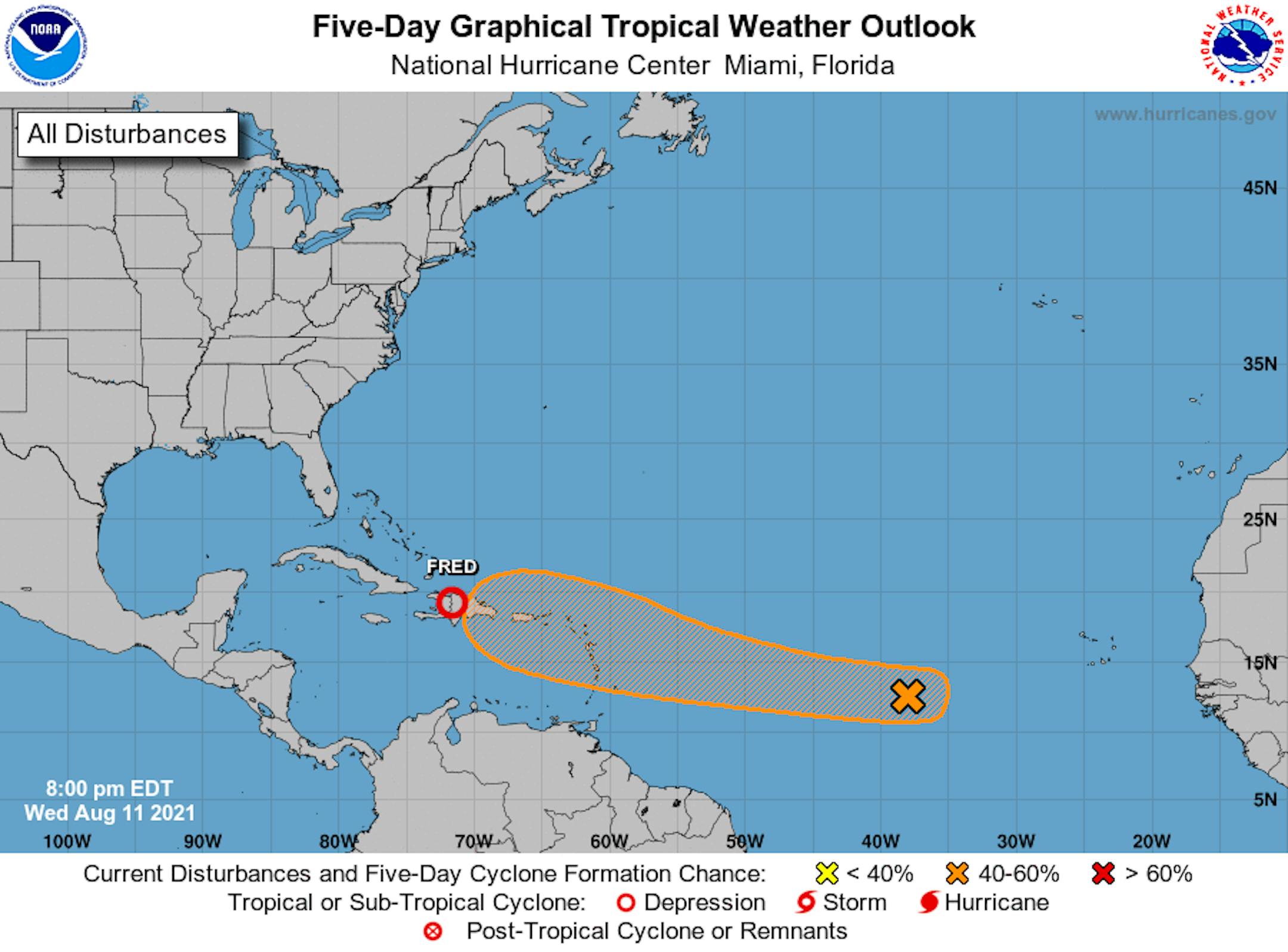 Here's a look at the IR Satellite Loop from Wednesday as Tropical Storm Fred moved over Hispaniola and dumped heavy rains over The Dominican and Haiti. Flash Flooding and Mudslides will be possible through the first half of Thursday as Fred slowly moves over the region. Fred was downgraded to a Tropical Depression PM Wednesday, but should regain Tropical Storm Status as it moves back over open water later this week.
