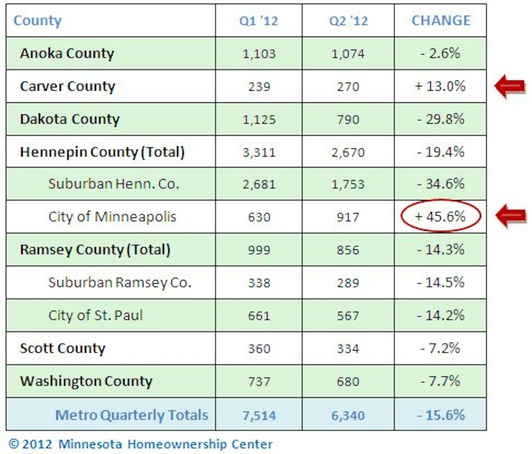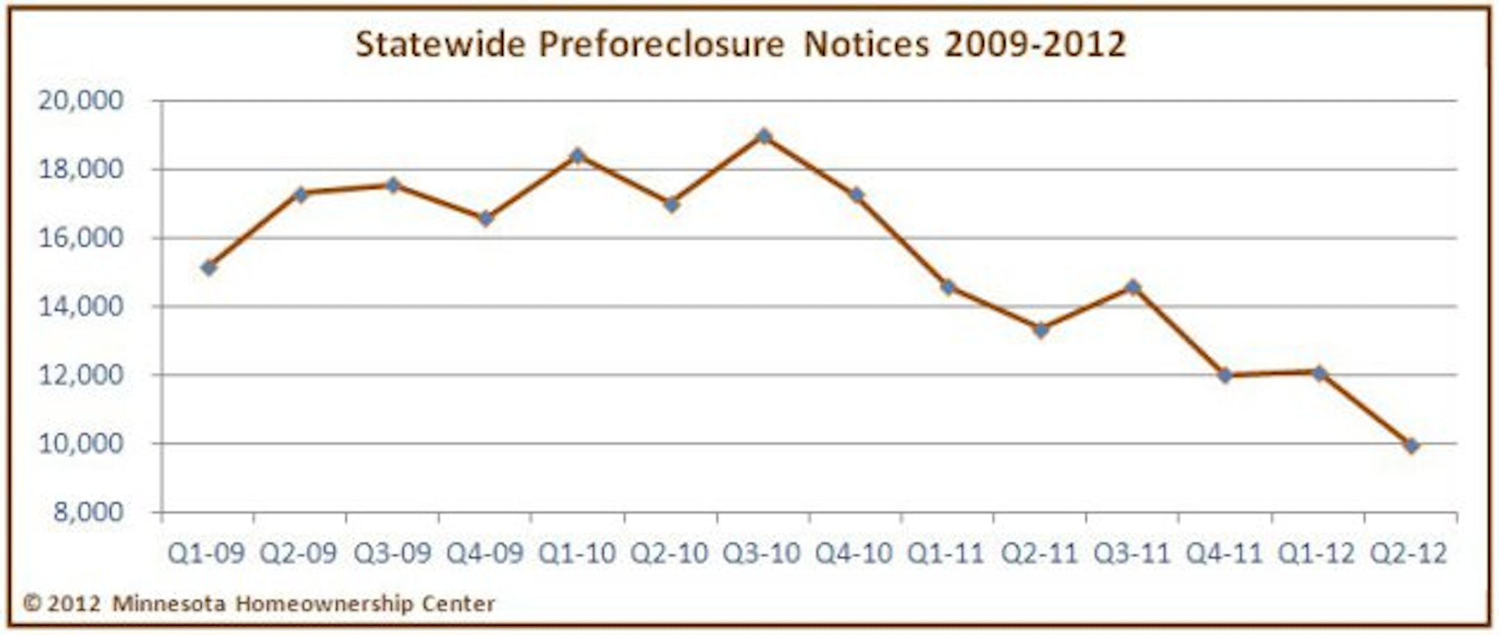 The Minnesota Homeownership Center said this morning that the number of preforeclosure notices received by its statewide foreclosure counselors has now fallen to its lowest level since 2008. The group said that during the second quarter 9,995 Minnesota homeowners received such preforeclosure notices, down 17 percent from the first quarter of 2012 and 25 percent from the same period last year.