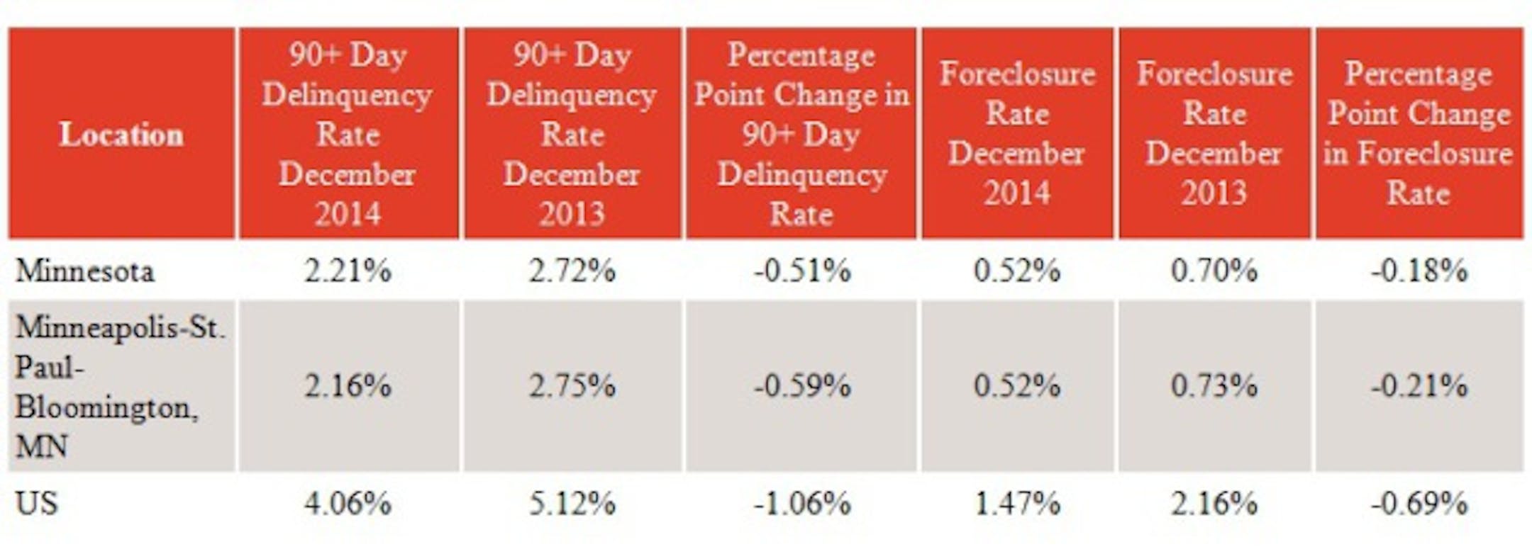 Rising home prices and a relatively healthy jobs market mean fewer people in the Twin Cities metro are falling behind on their mortgage payment. The foreclosure rate in the region dipped to 0.52 percent during December 2014 from 0.73 percent last year, according to a monthly report from CoreLogic. Nationwide, the foreclosure rate stood at 1.47 percent for December 2014.
