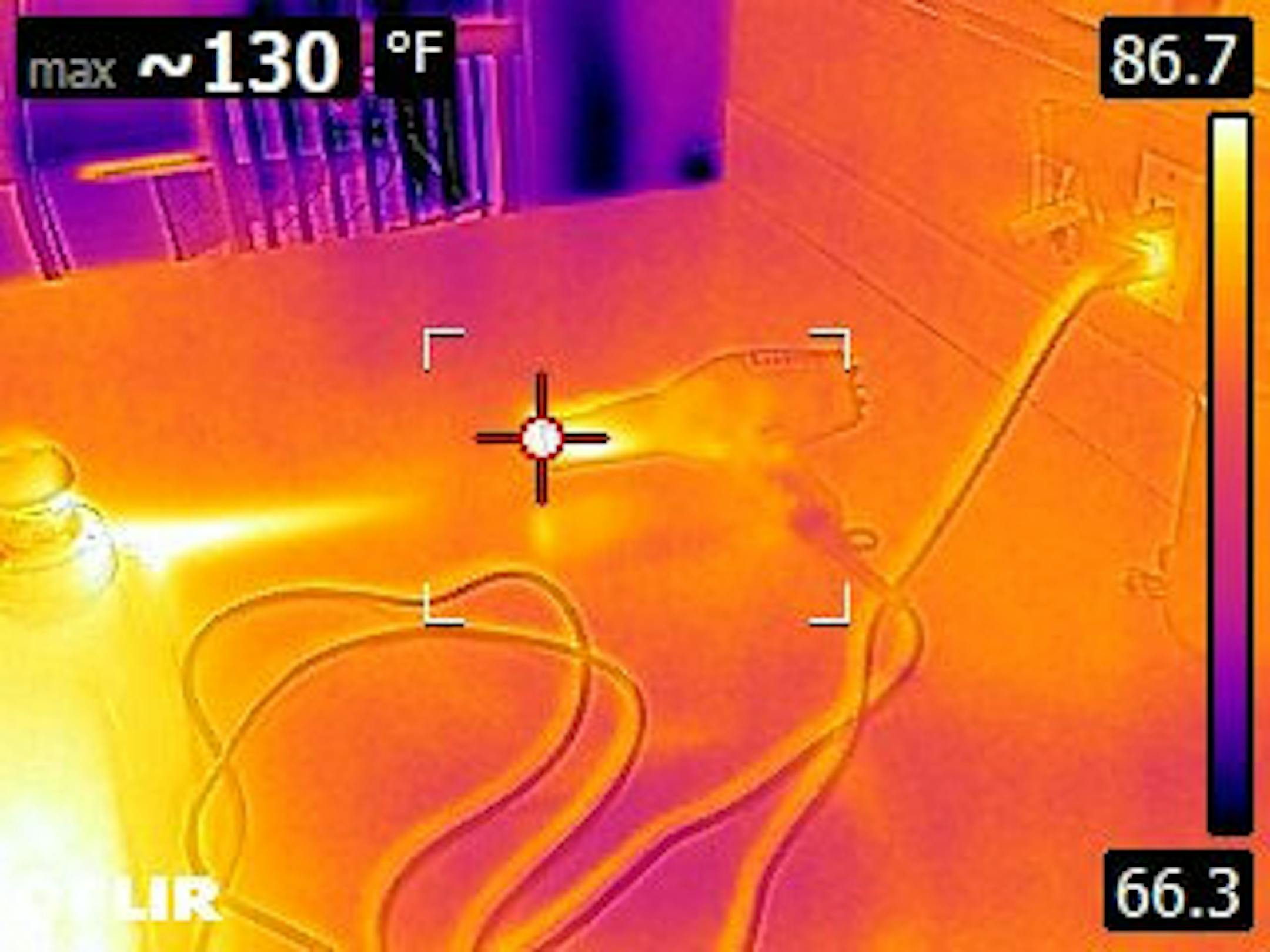 Use a hair dryer or a heat gun to thaw your faucet. This will take a long time with a hair dryer, but it'll happen eventually. If you choose to use a heat gun, be very careful. That's not a high-powered hair dryer, it's a heat gun. It'll blister paint, melt vinyl siding, and start paper on fire. The two infrared images below show a heat gun on the left and a hair dryer on the right; note the temperatures shown at the top left corners of images.