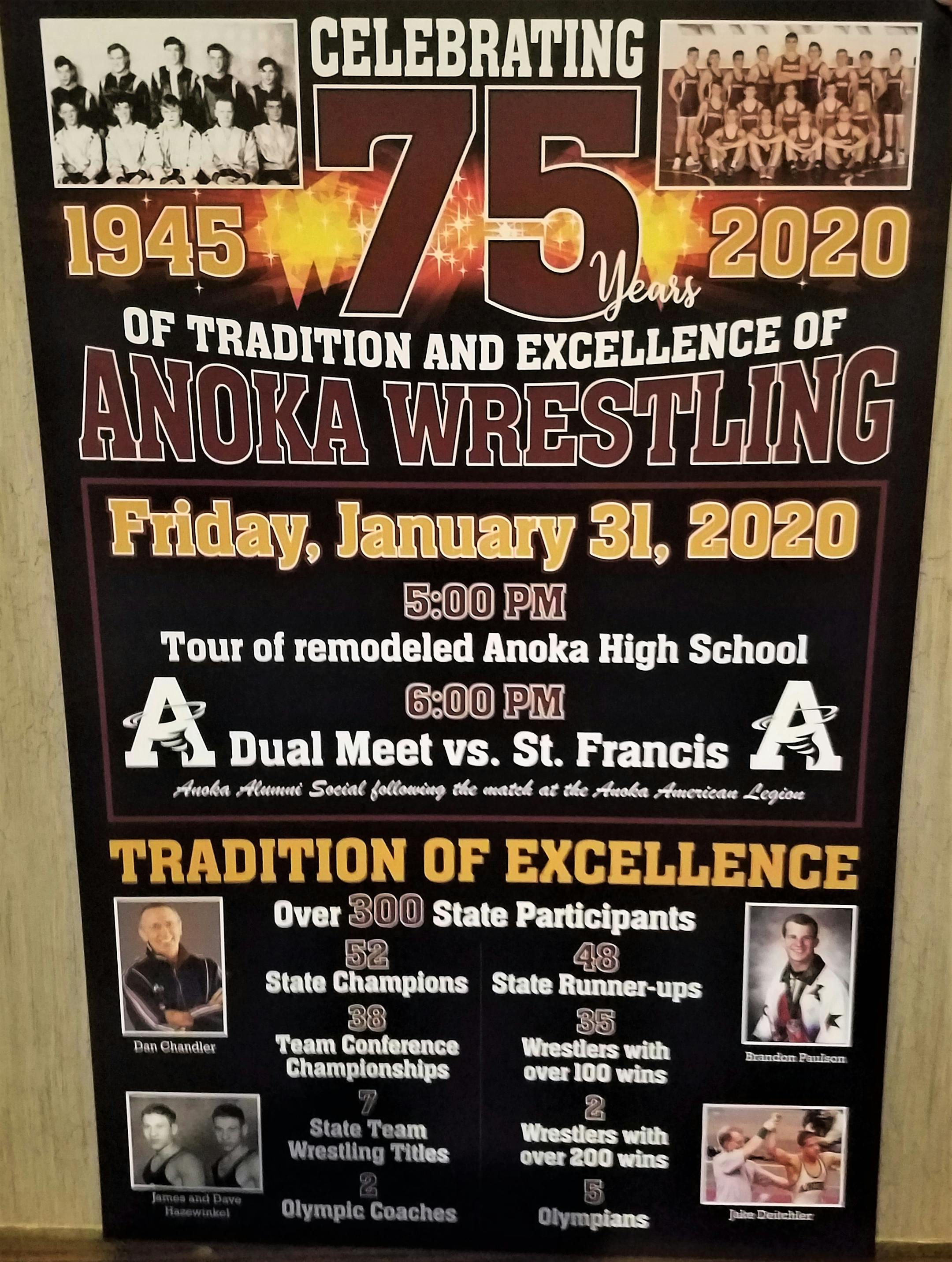 Centered around a dual meet against St. Francis, the Anoka Wrestling Alumni booster club is sponsoring 75 Years of Anoka Wrestling on Friday at Anoka High School.
