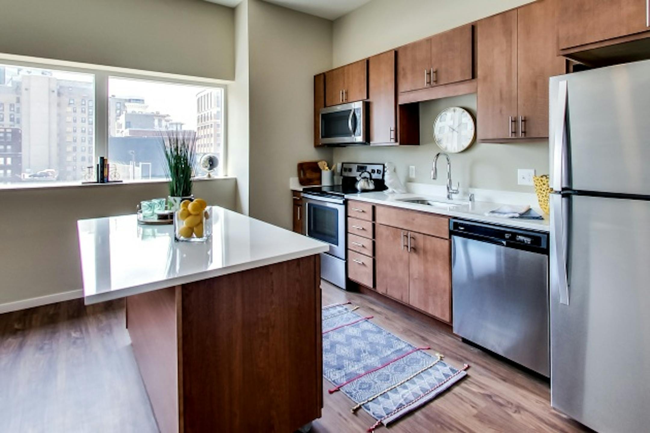 Some of the apartment complex's amenities include a game room, theater room, yoga room with digital fitness classes and high-end finishes such as stainless steel appliances and quartz countertops. The building is connected to the skyway.