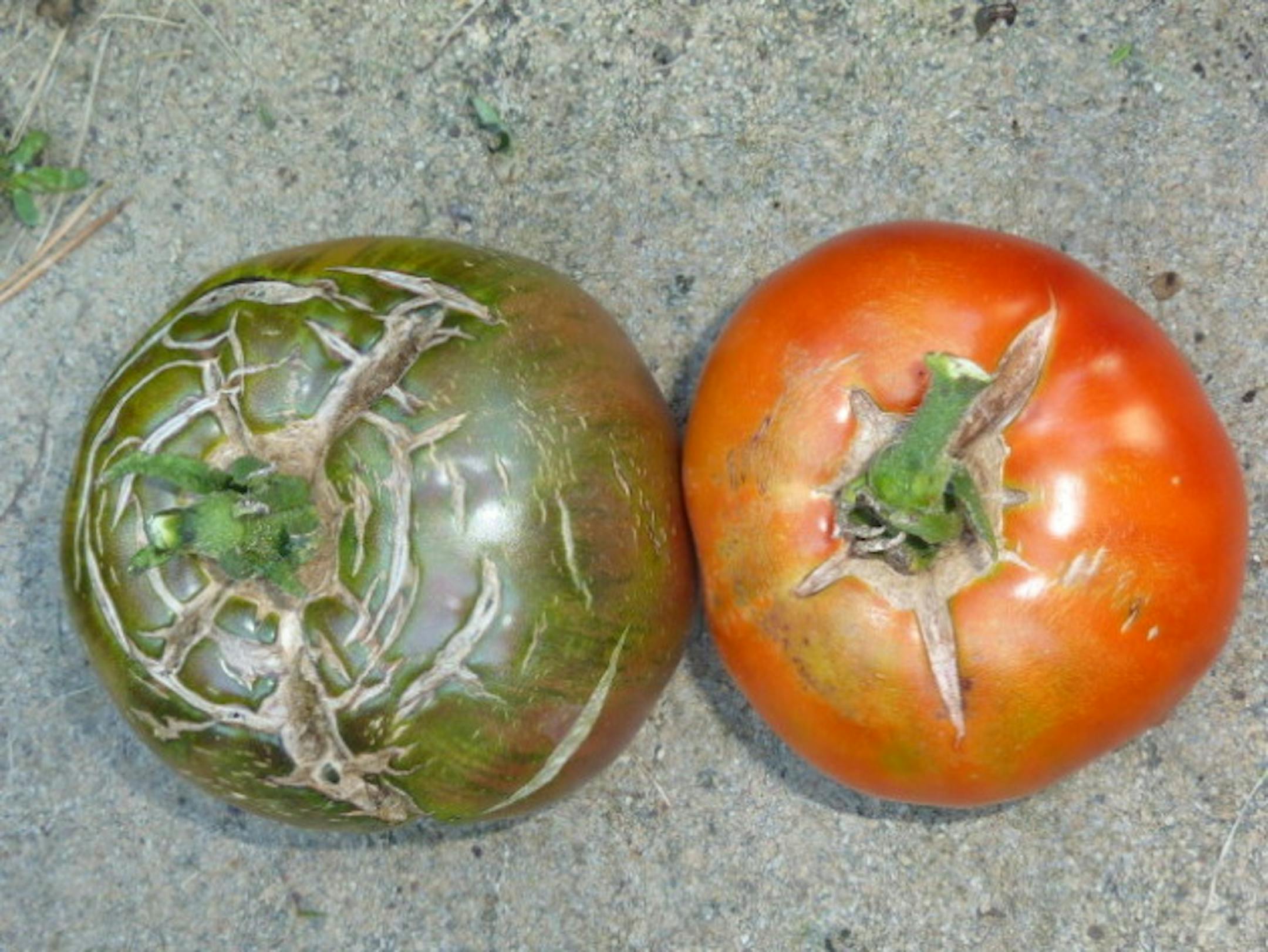 Lunker tomatoes are deliciously awesome but the purple color and looks may put some people off. These photos show top and bottom of the Brandywine (red) and Cherokee Purple (purple, cracked). Both have delicious flavor and the Cherokee Purple tastes less acidic than most. A friend said that she brought a purple tomato salad to a potluck and everyone stayed away from the bowl until she actually explained they were supposed to be that color. Once Mikey tried it, the bowl was cleaned out!