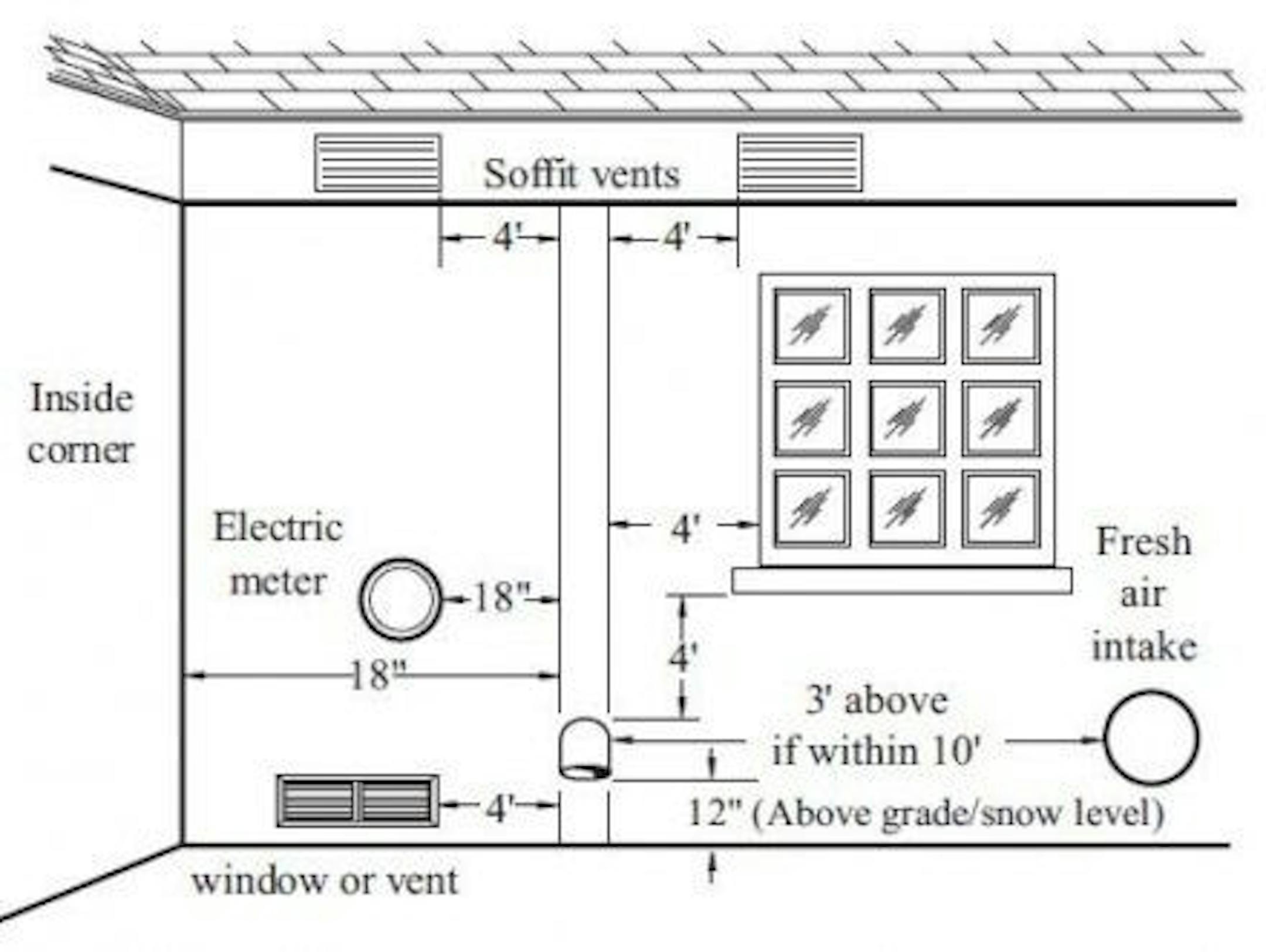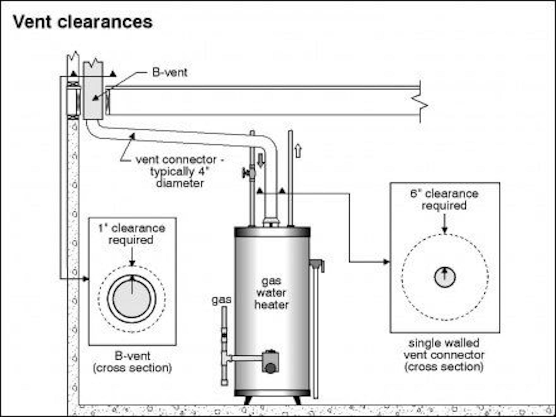 - For a powervent water heater, the manufacturers installation instructions must be followed: they all seem to use the requirements in the diagram below for the vent terminal location. The one that is done incorrectly most often is the distance to the fresh air intake.