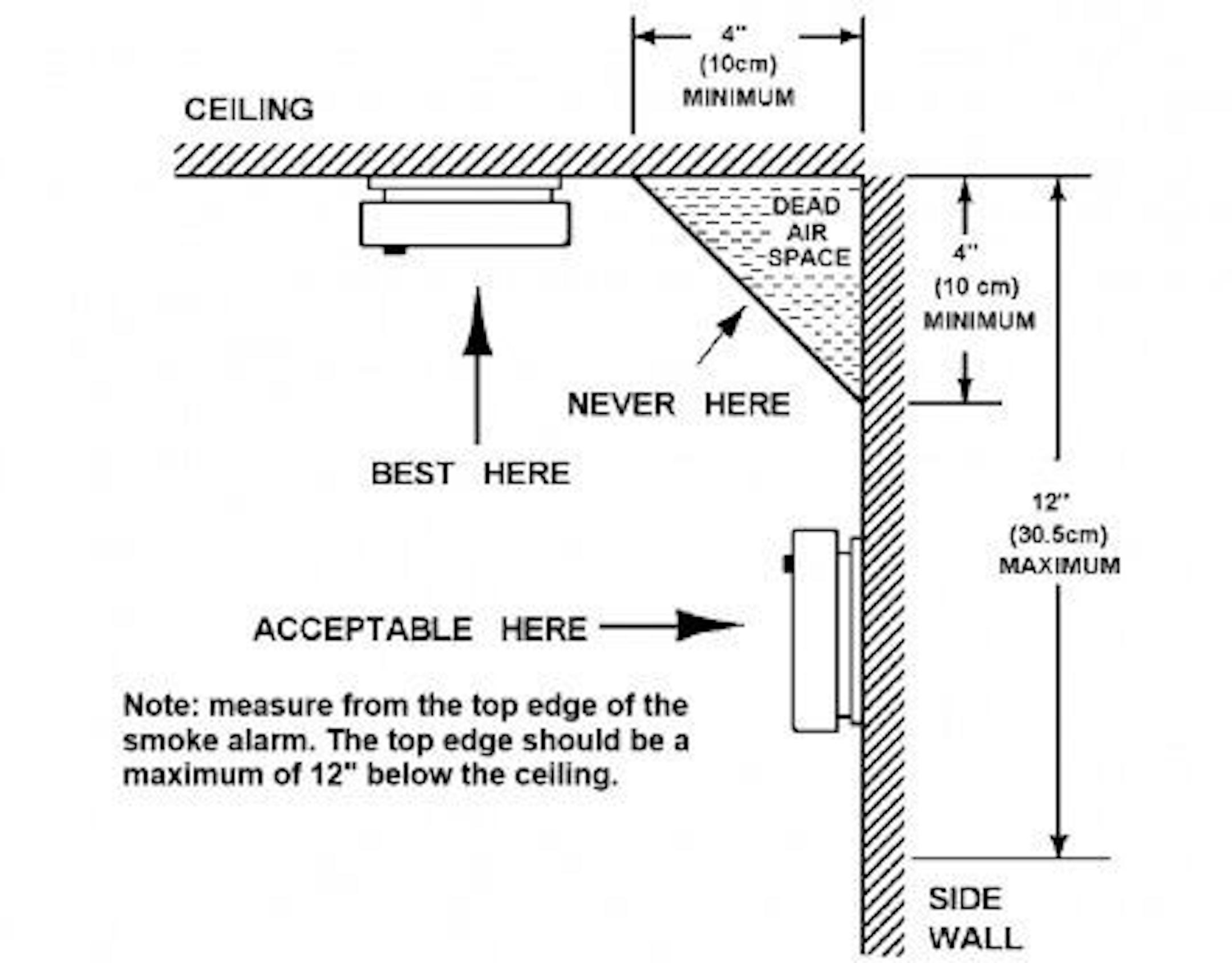 The manufacturers installation instructions should be followed when installing smoke alarms. The best place for a smoke alarm is typically on the ceiling, in the middle of the room. If the smoke alarm is going to be installed on a wall or on the ceiling near a wall, don't place it too close to the corner. Most manufacturers recommend locating smoke alarms at least 4" away from corners.