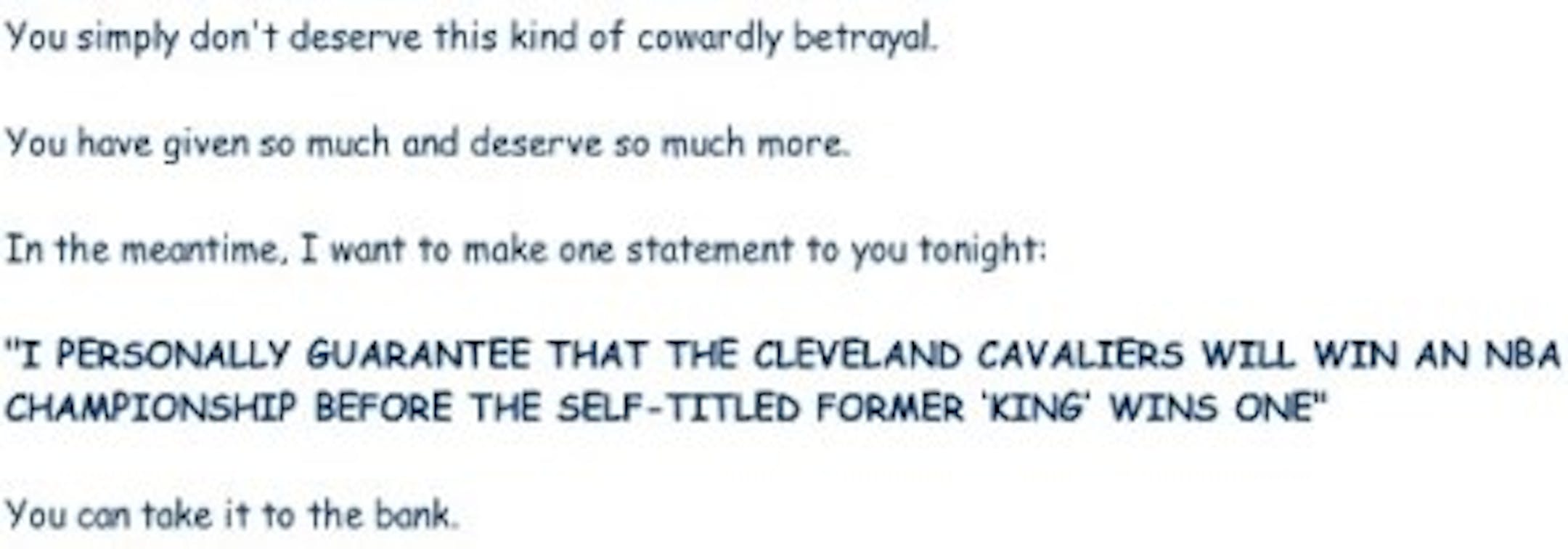 No, the biggest thing we still remember about that crazy time is that Cavs owner Dan Gilbert wrote the angriest, you-just-broke-up-with-me-in-eighth-grade letter about LeBron and the betrayal. But he didn't just write it. He released it to the world using the font Comic Sans, adding so much to the impact of it.