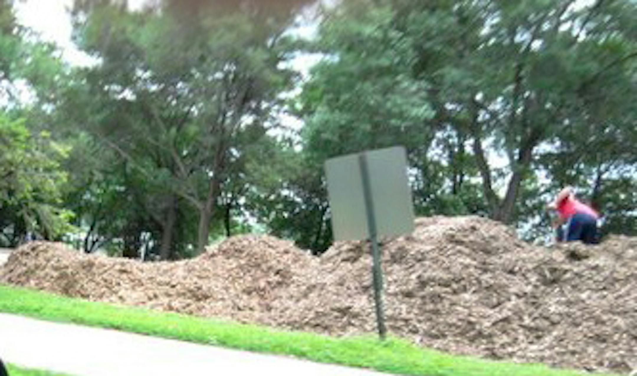 Thanks to the mega storm that took down multiple trees, there's a monster pile of free wood chips in the parking lot on the north side of Lake Nokomis in south Minneapolis. Lots of people were out with shovels taking advantage of it today, but I'm guessing it will be replentished often, given the sheer volume of trees yet to go through.