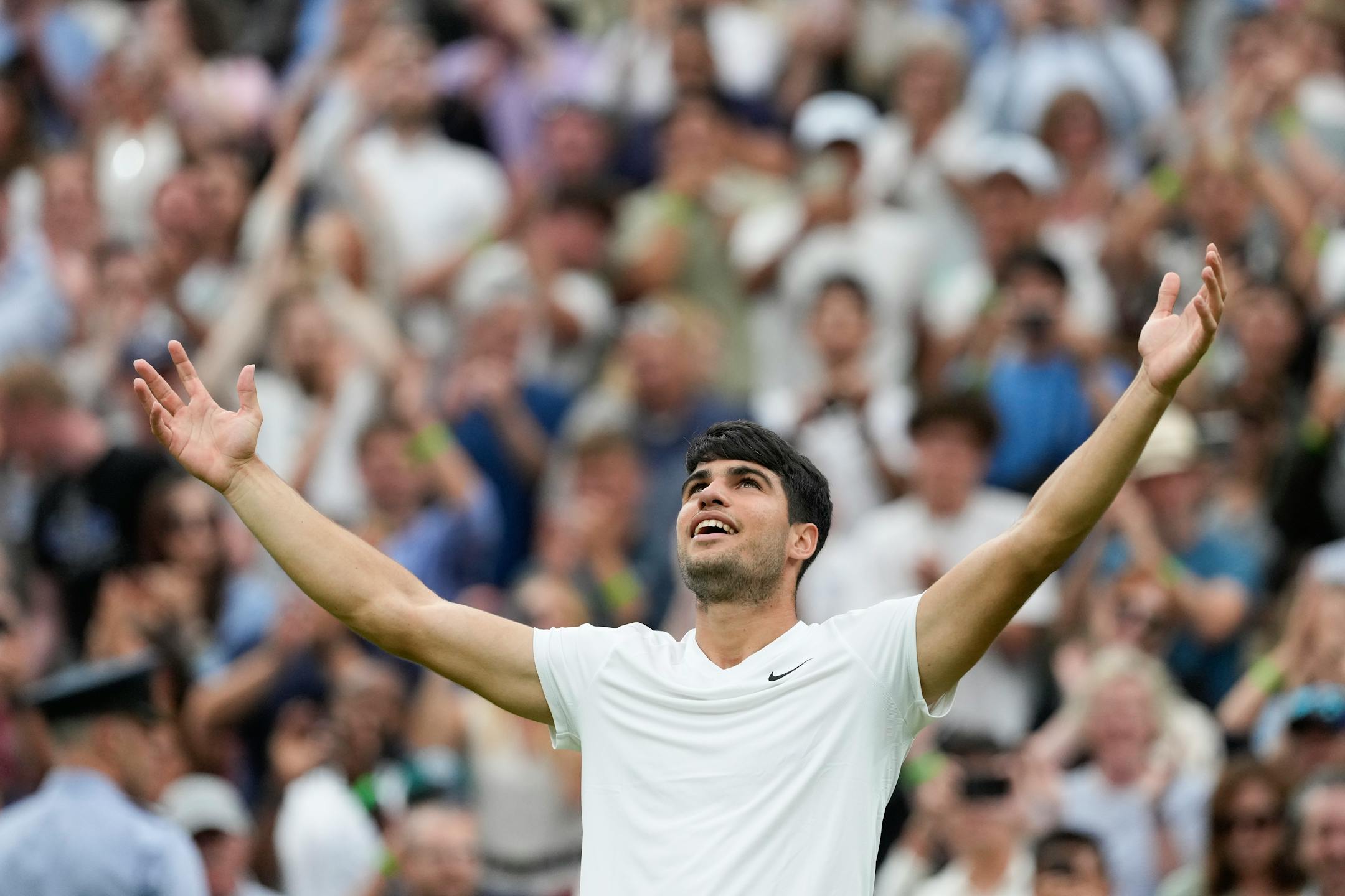 LONDON — Carlos Alcaraz found himself pushed to a Grand Slam fifth set again, this time at Wimbledon, this time against good pal Frances Tiafoe. And as he usually does under such circumstances, no matter how much trouble he might have been in, Alcaraz surged to the finish.