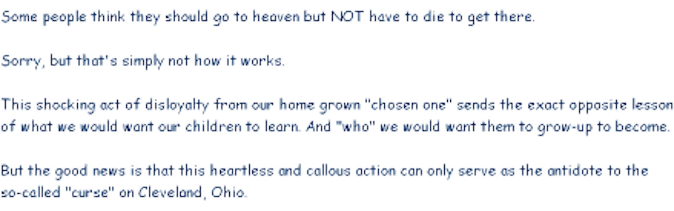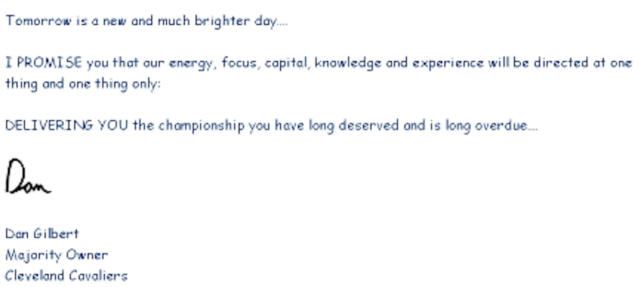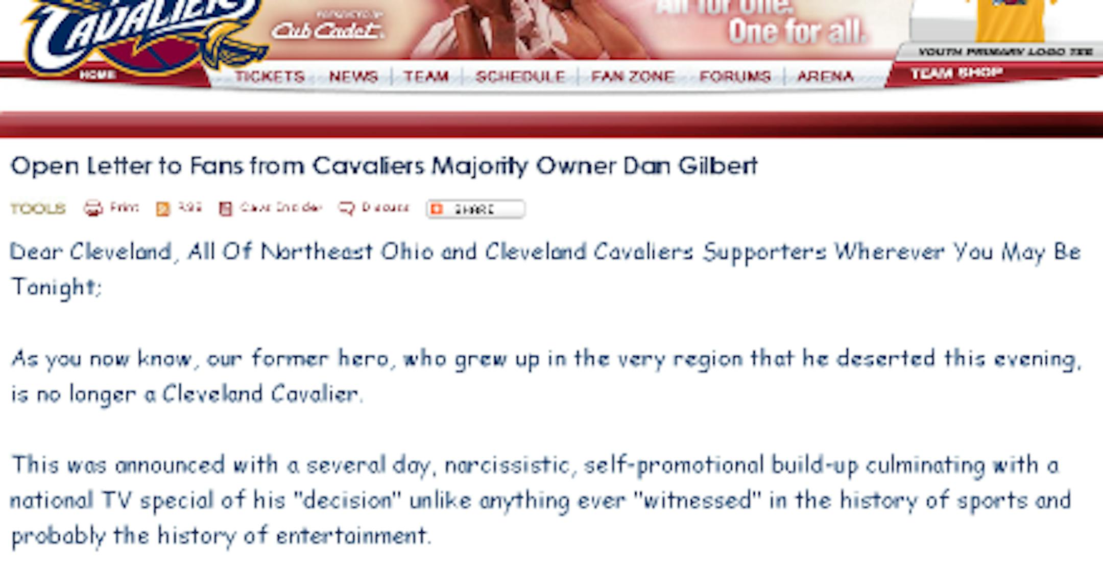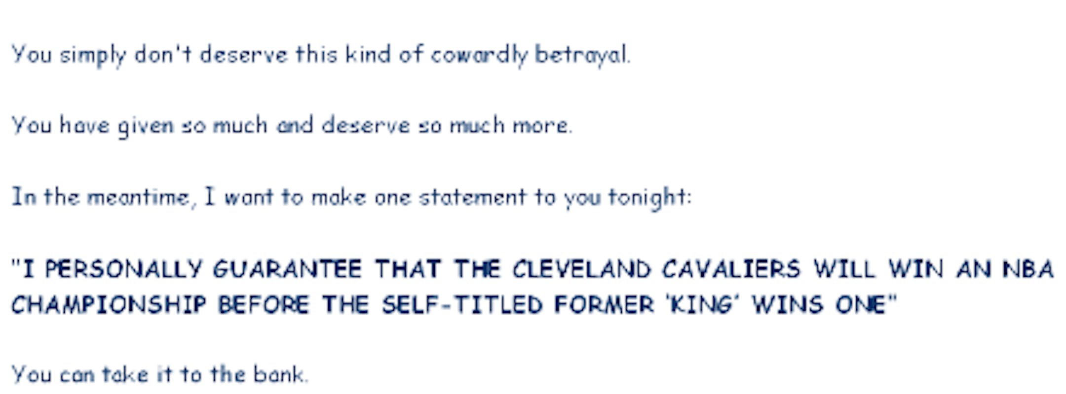 Let's start with Dan Gilbert's letter, which will be sprinkled into this post via screen grabs. Holy [redacted]. You never see that. Ever. A complete evisceration. He burned the bridge to the ground, then lit the ashes on fire, then peeled off a layer of LeBron's skin, used it to roll the ashes into a LeBron-skin cigar, then smoked it. It was like a drunk 3 a.m. e-mail to someone who just dumped you. Only instead of hitting delete because the catharsis was really just in writing it, Gilbert hit send. It wasn't terribly professional, but we have to say: Cleveland probably needed and deserved it. LeBron certainly deserved it.