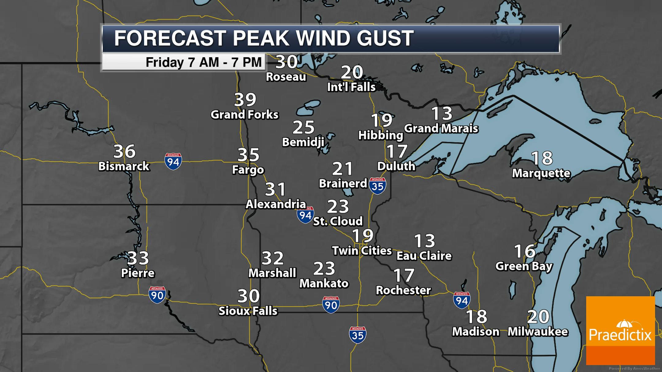 Southerly winds will increase as we head through the morning hours, changing to be out of the northwest into the overnight hours as that system brings those rain chances in mainly northeastern Minnesota. Gusts to 20 mph will be possible in the metro during the daytime hours (potentially reaching 30 mph Friday Night) but could approach 40 mph in the Red River Valley.