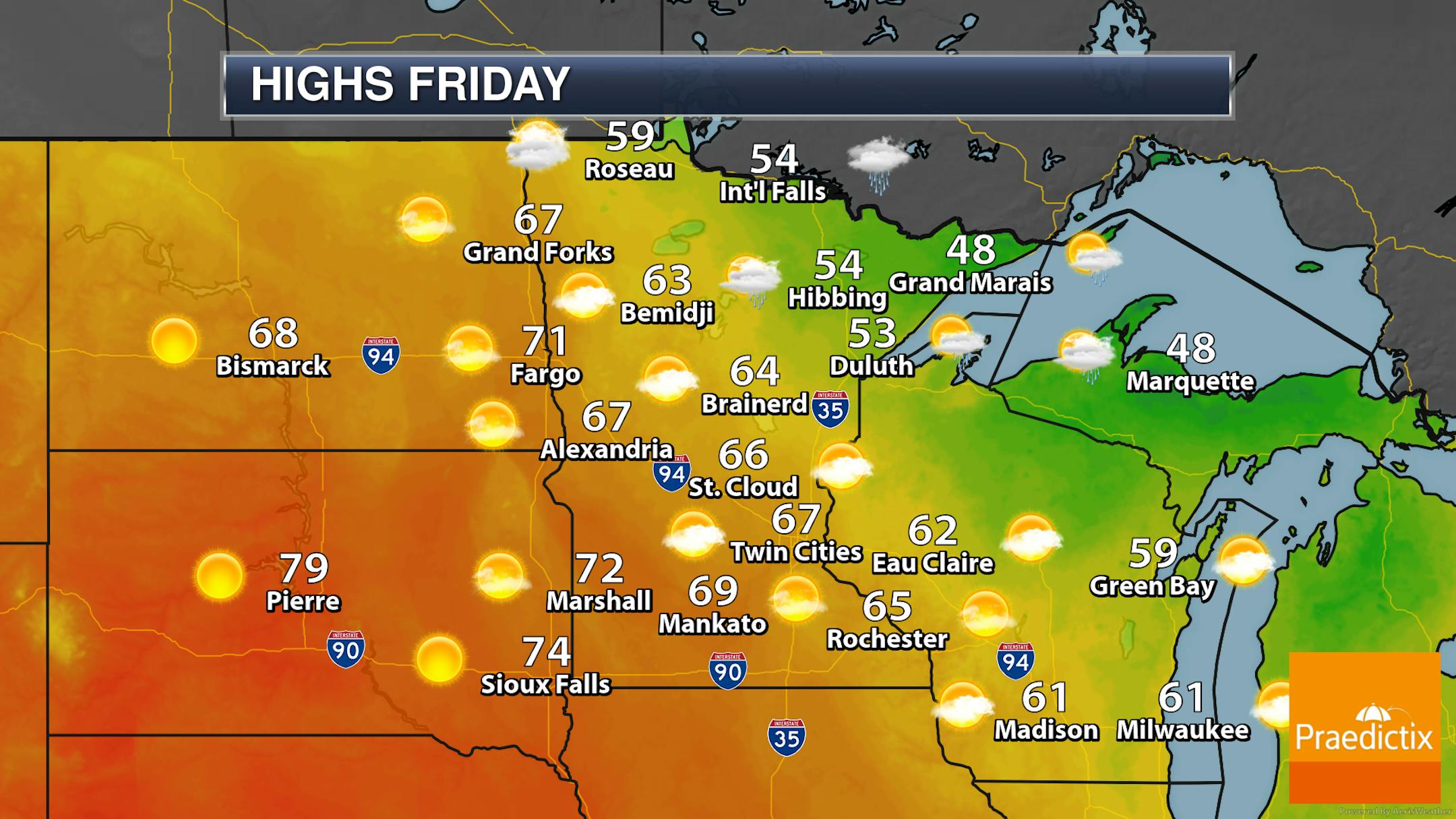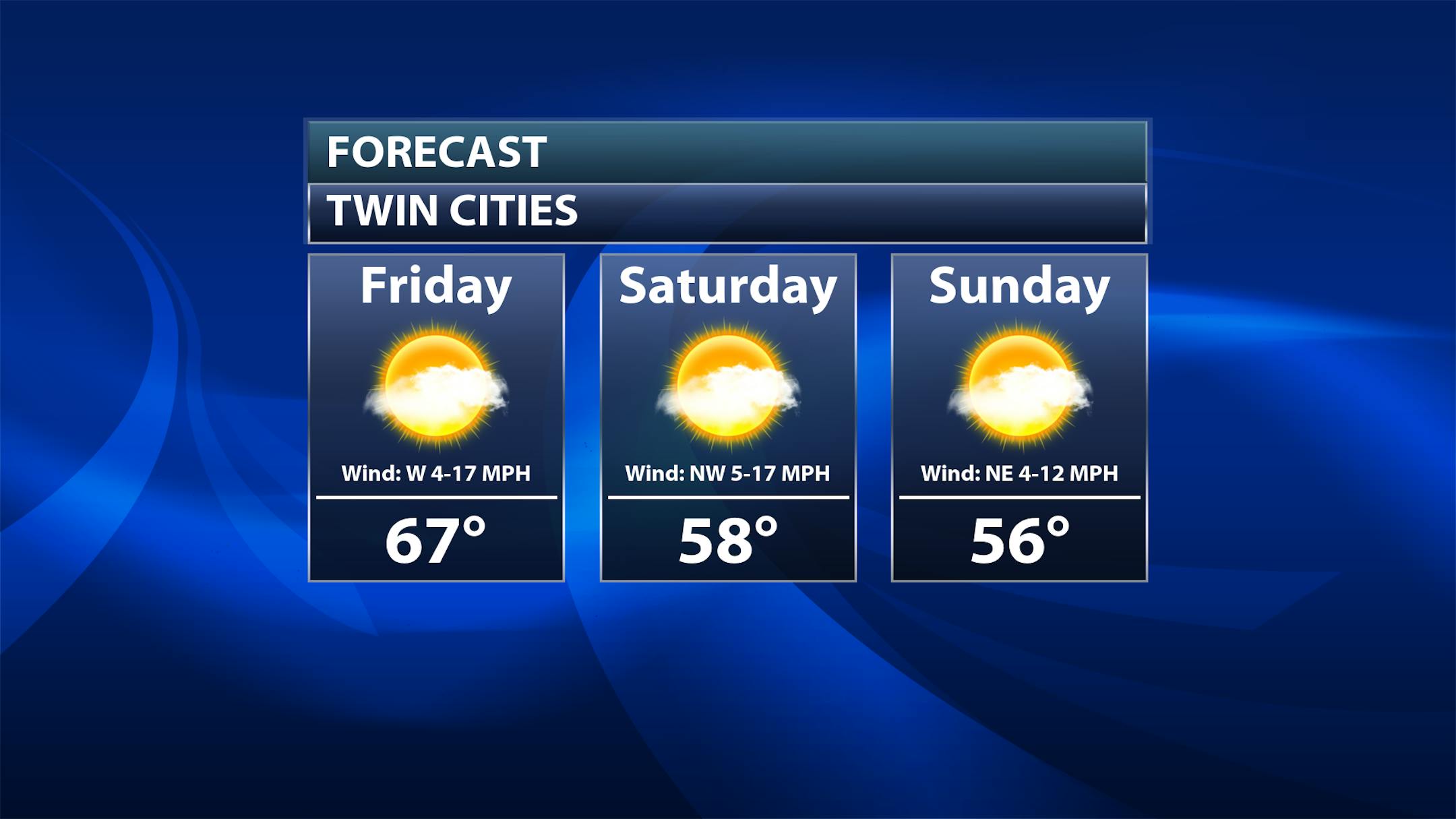 A wide range of temperatures are expected for Friday across the state, with 40s along the North Shore to the 70s in far western Minnesota. A system moving through the region will bring the potential for a few showers across mainly northeastern Minnesota. Otherwise, mainly sunny skies are expected the farther southwest you go.