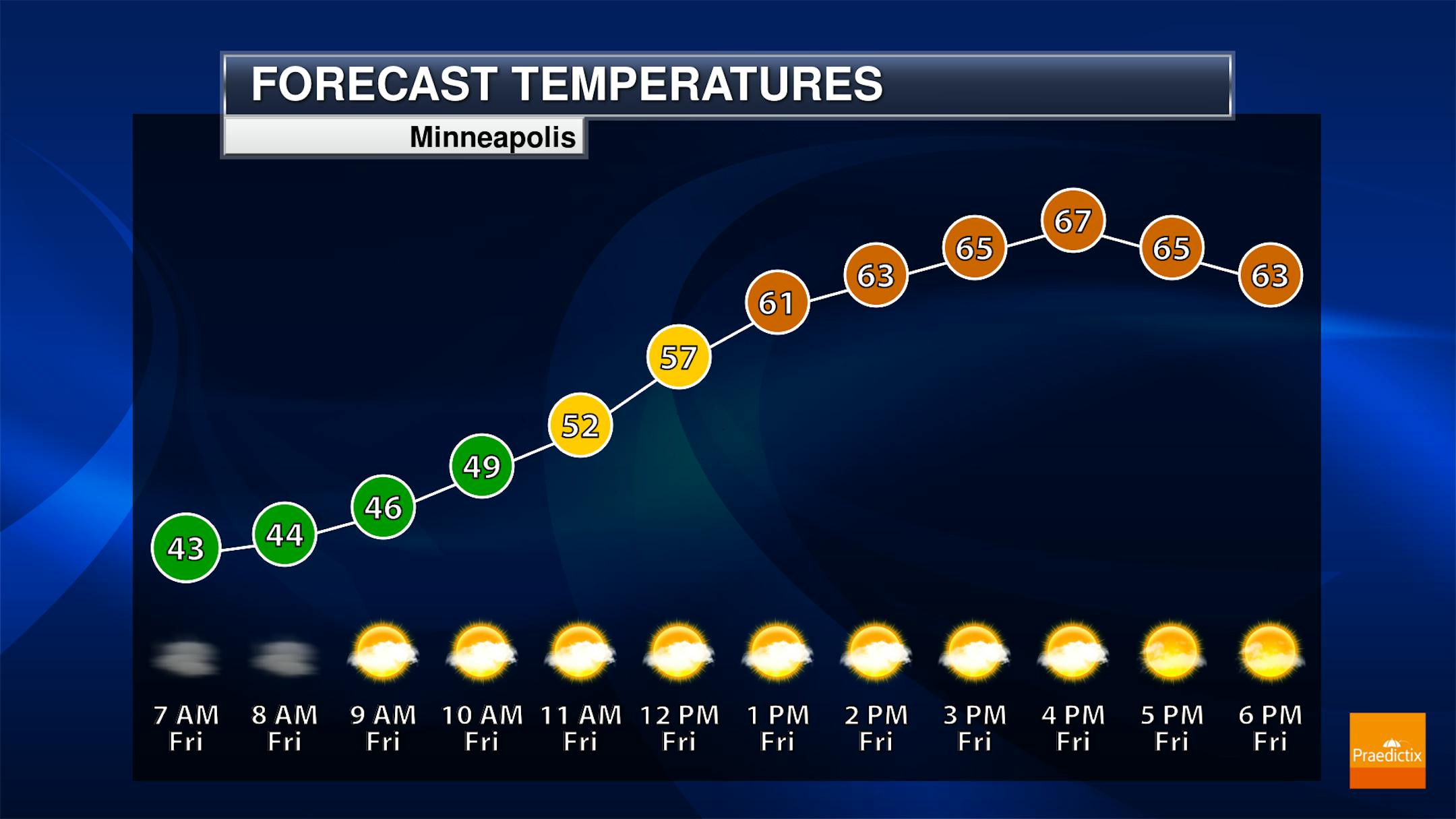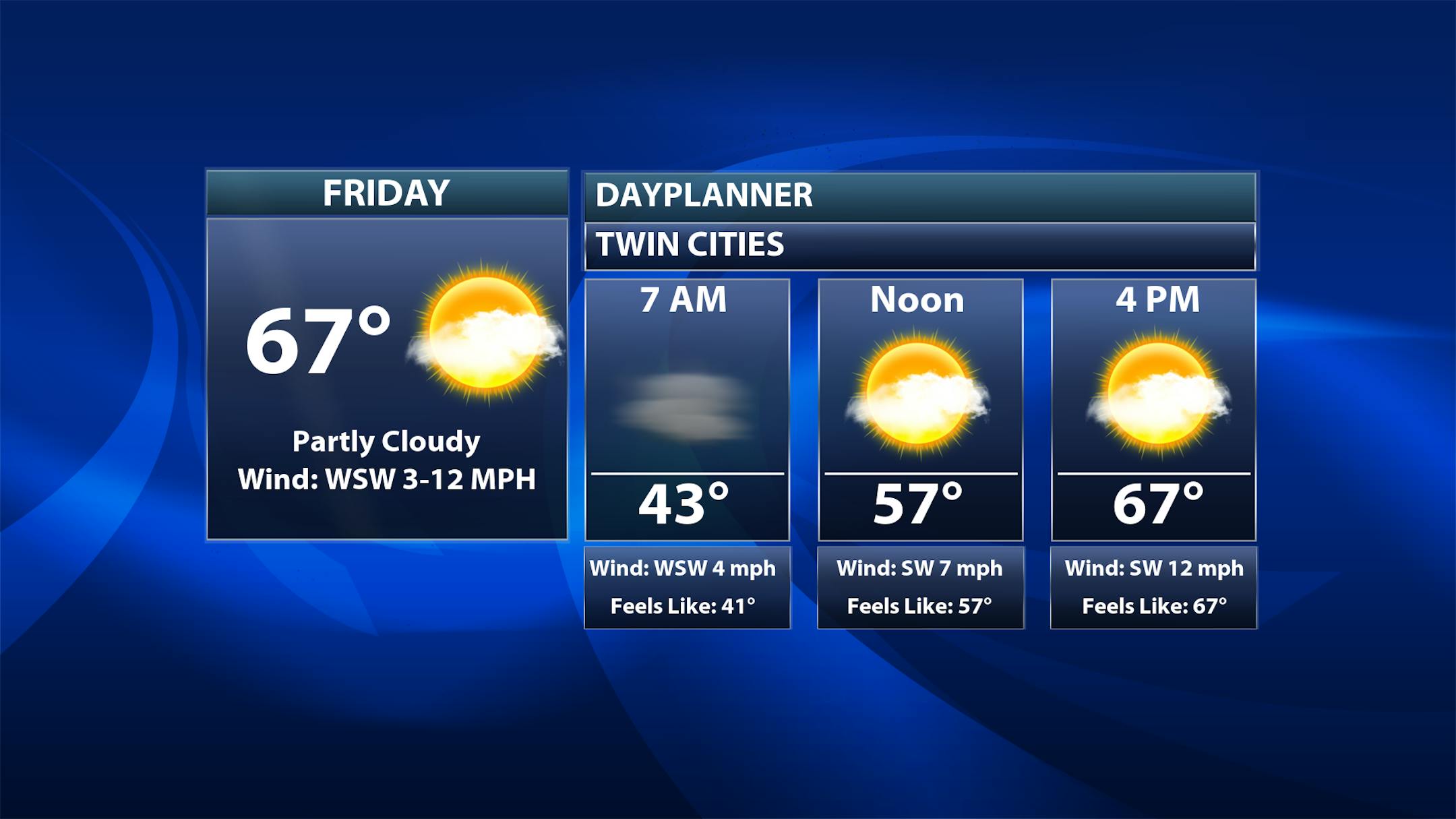 Areas of fog will be possible in the morning hours on Friday in the metro before we see a mix of sun and clouds throughout the day. The increase in cloud cover will be partly due to a system that could bring a few rain showers north of the metro. Morning temperatures start off in the low 40s with highs in the mid-60s - the warmest day of the next several.