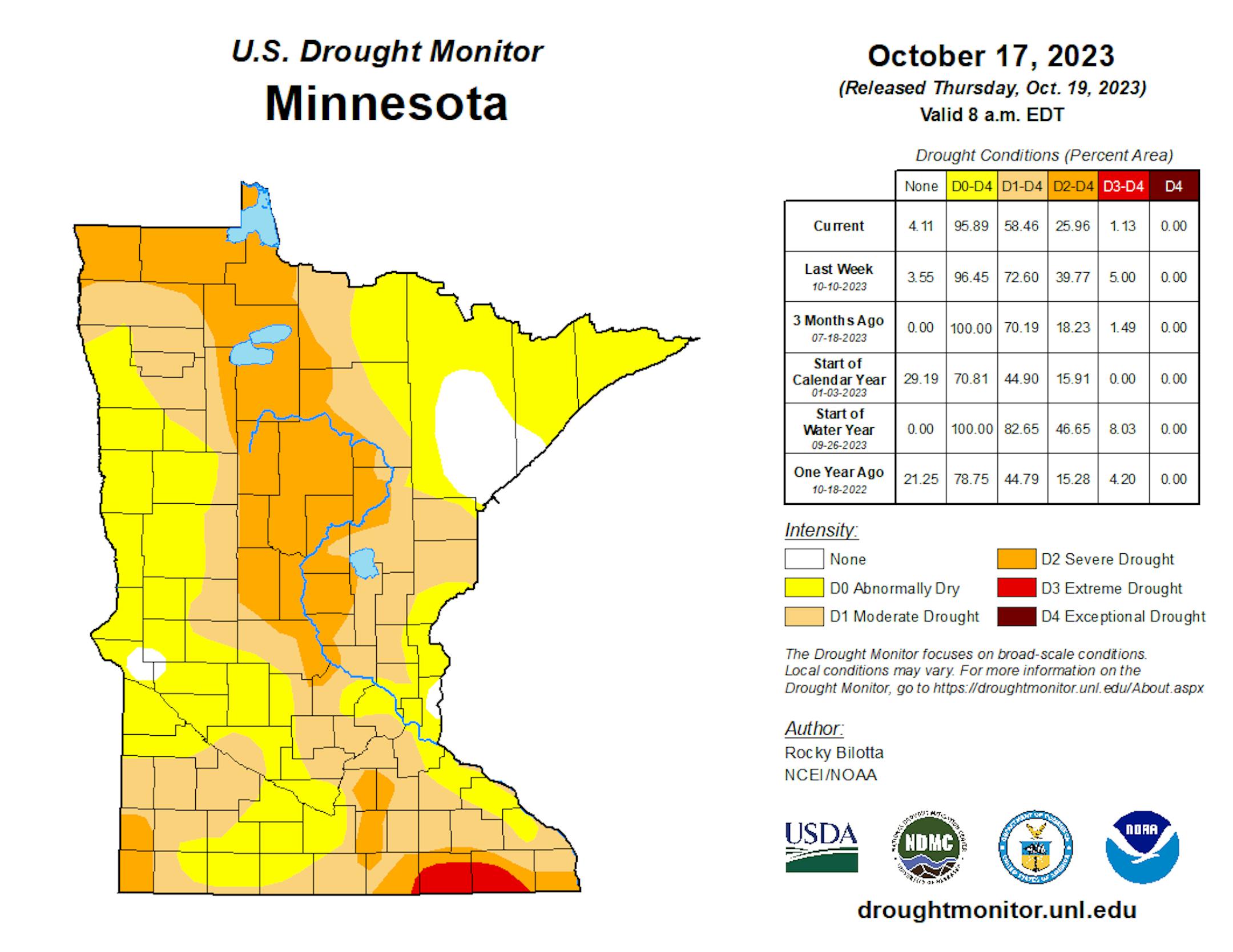 The rain last week once again brought beneficial moisture and decreased the drought across the state. While ~95.9% is still at least abnormally dry, the amount of Minnesota under D3/4 (Extreme) drought is down to 1.13% across parts of southern Minnesota near Austin - the lowest coverage of D3 drought since mid-August.