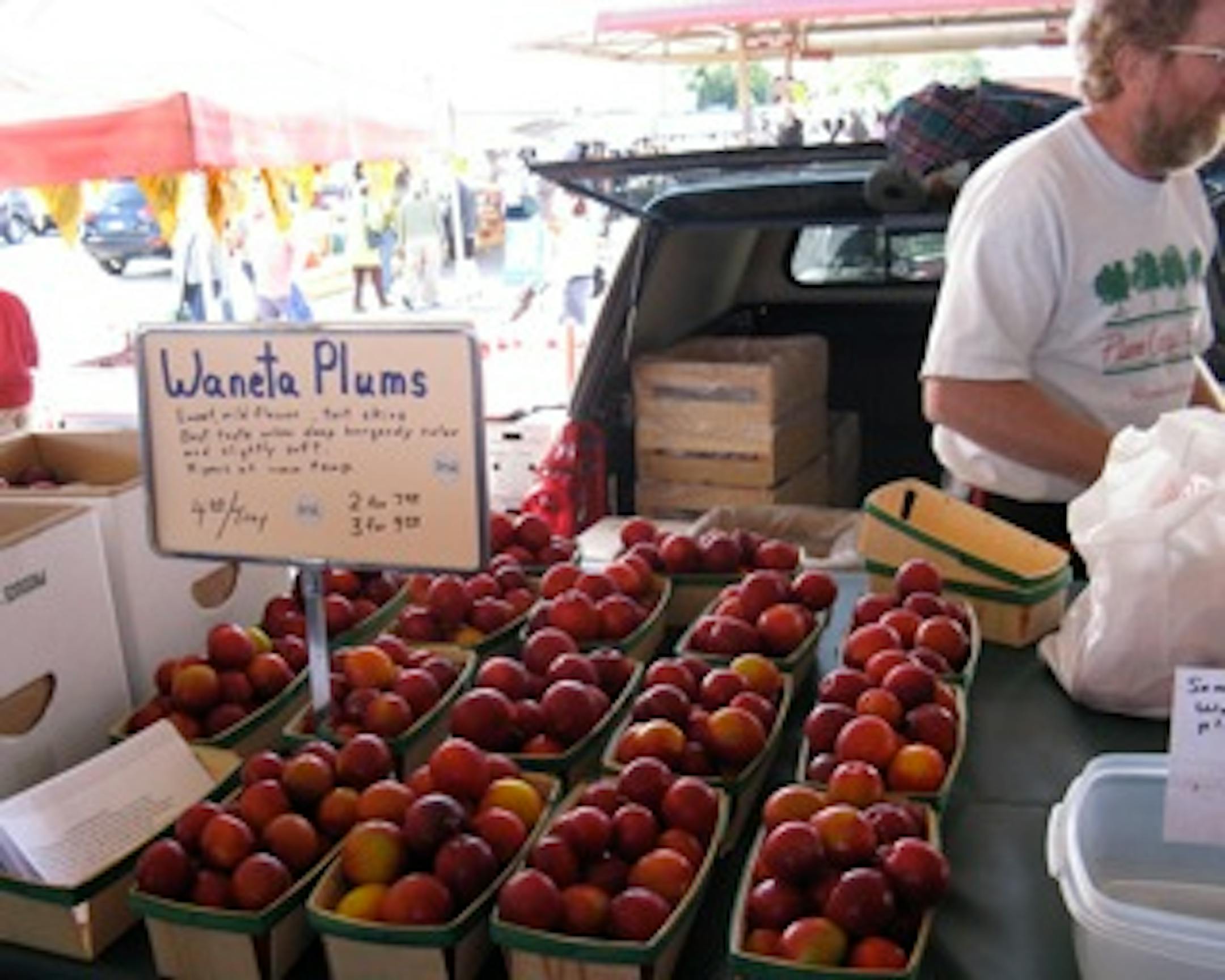 One steadfast rule for farmers market shoppers: Follow the crowds. Last Saturday at the Minneapolis Farmers Market, shoppers were standing three and four deep at the Plum Crazy Orchard stand, and owner Dick Brown was busy keeping his table stocked with colorful Waneta and Toka plums. It took several minutes to work my way to the front of the stand, where I finally got a good look at what the fuss was all about. It was well worth the wait. The orchard's plums -- cherry streaked with gold, almost the color of the heirloom tomatoes I spied further down the aisle -- were gorgeous, and the scent was amazing.
