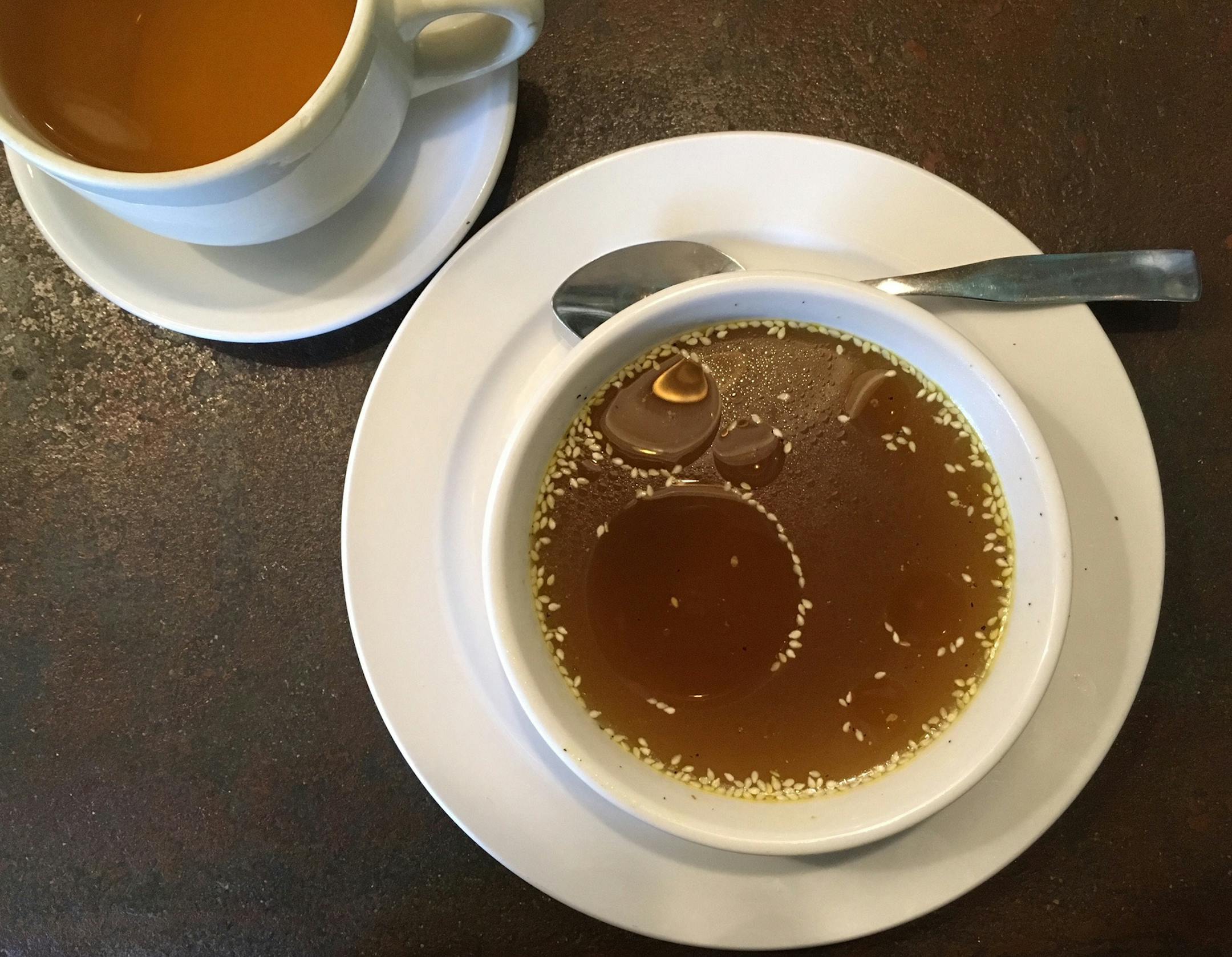 Because they're such an expedient way to warm up from the inside out, it's great to see bone broths — light, uncomplicated and nutritious — popping up on menus. At this cozy counter-service spot — which has been promoting wellness for 50 years — chef Sam Needham nurtures a pair ($5 and $6) of options. One starts with bones from grass-fed cattle, their flavors boosted by ginger, turmeric and thyme. His vegan version gets its oomph from shiitake and orange-tinted reishi mushrooms, amplifying the combination's gentle earthiness with sesame.