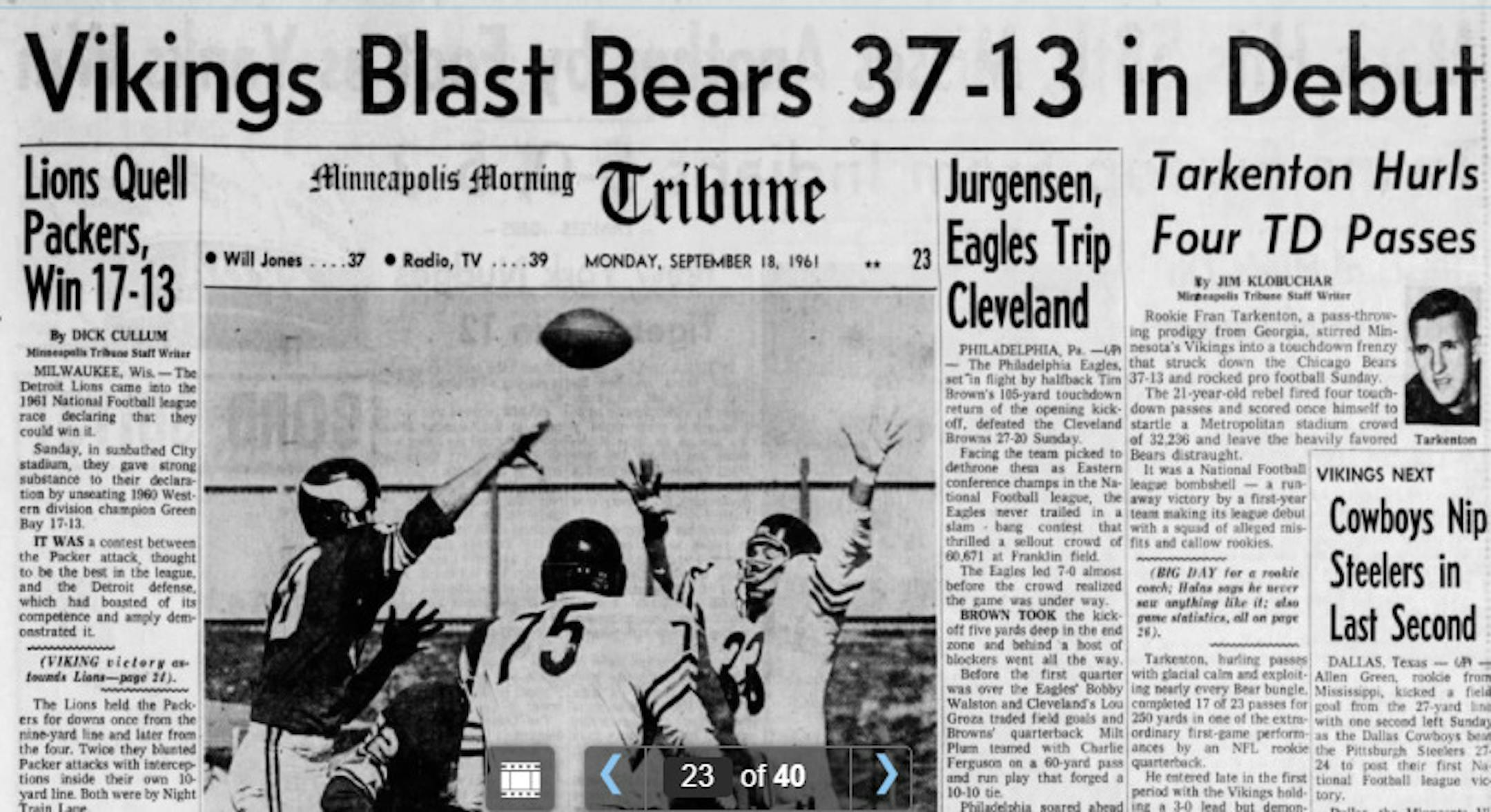 Rookie Fran Tarkenton, a pass-throwing prodigy from Georgia, stirred Minnesota's Vikings into a touchdown frenzy that struck down the Chicago Bears 37-13 and rocked pro football Sunday.