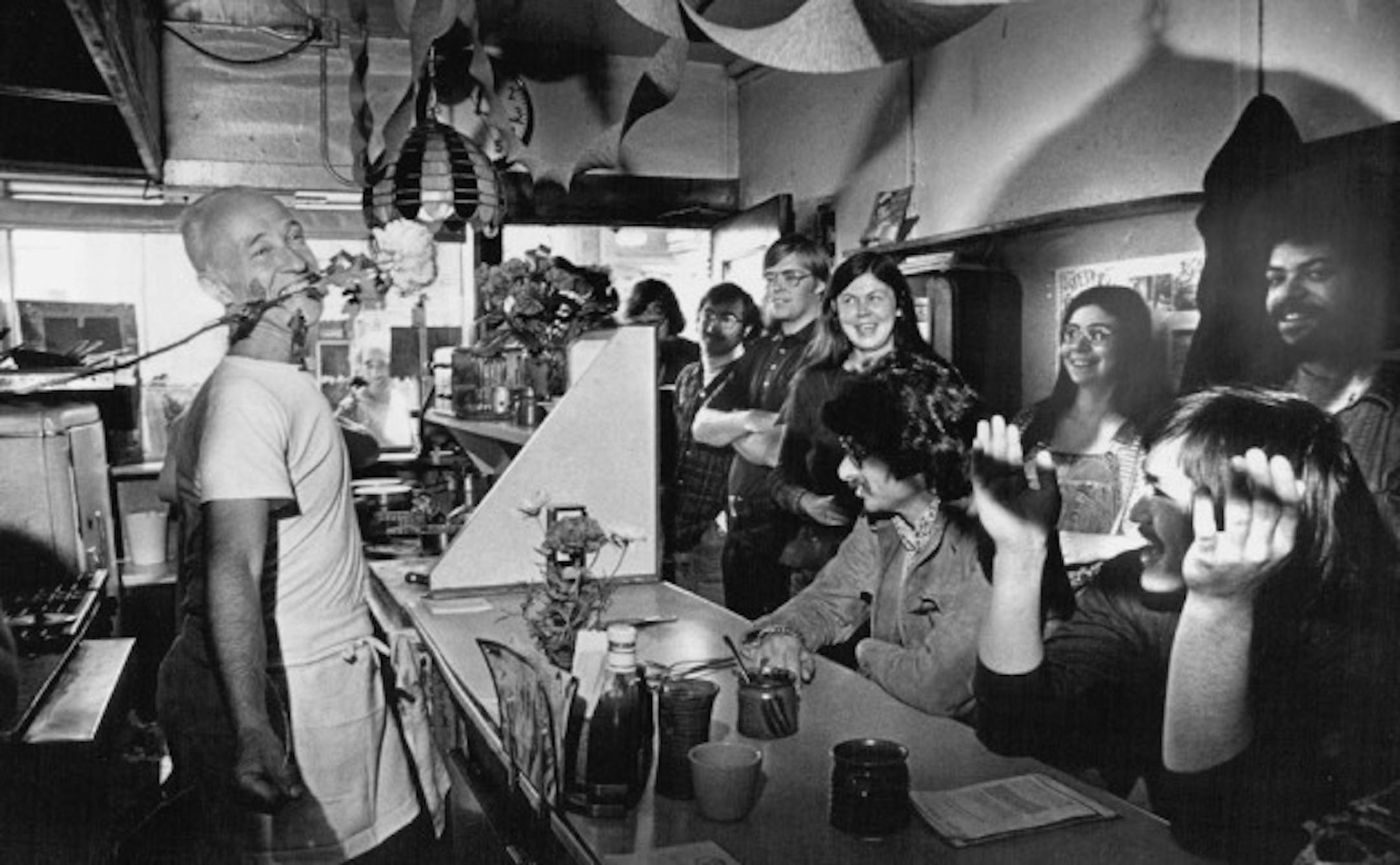 May 16, 1980: "Al Bergstrom looked on as his nephew was kissed by a customer," reads the caption. "It was Al Bergstrom Day on Thursday [May 15] as Al's Breakfast in Dinkytown celebrated its 30th anniversary. Al, age 74 and seven years retired to Forest Lake, was back -- minus his dirty white T-shirt and chef's hat -- clowning around with customers as he always did. You might say the diner was packed except, as any regular knows, Al's is always standing-room-only at breakfast time." (Photo by Duane Braley).