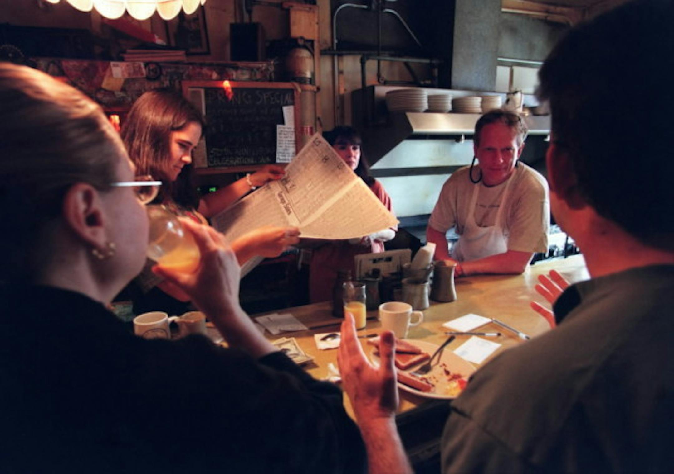 May 11, 2000: "Al's Breakfast has been a Dinkytown tradition for 50 years," reads the caption. "Little has changed, including the long lines of people waiting for one of the 14 counter seats. Longtime (35 years) customer Tom Roe, right, and his wife Robyn Roe, left, chat with co-owner Doug Grina, 13-year-employee Mary Rose Ciatti and four-year-employee Alison Kirwin (reading paper) as the Al's Breakfast crew attempt to help the Roes choose a dog from the newspaper on Thursday morning." (Photo by Ann Heisenfelt).