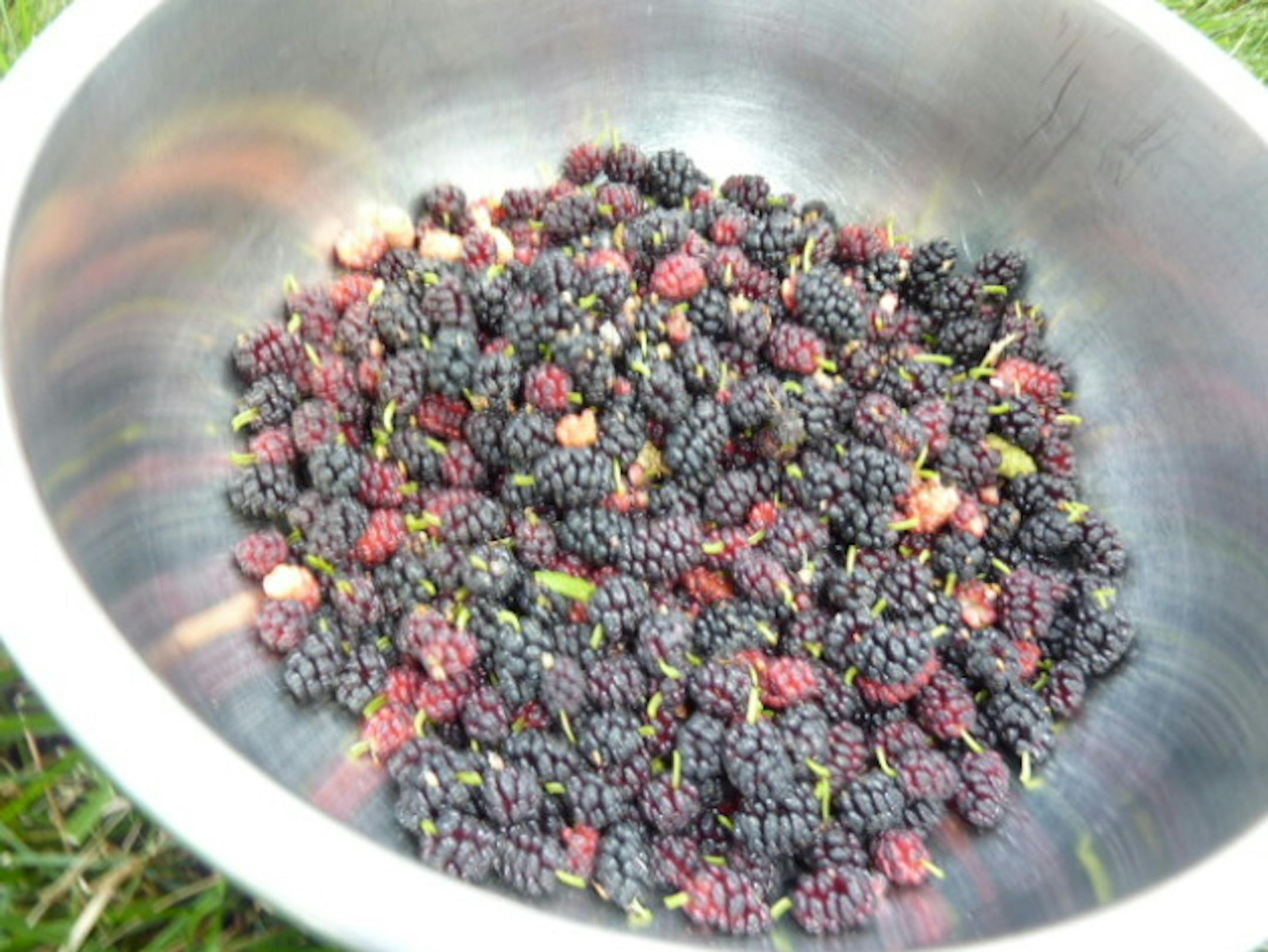 Last year, to my great surprise, I found that I had a mulberry bush growing. I was watching a chipmunk climb up a tree all the way out to the end branches. It was comical, he almost fell -- so I wanted to check out why he was performing such antics. Then I researched and found I had a mulberry. This year, I was prepared to get the berries before the animals.