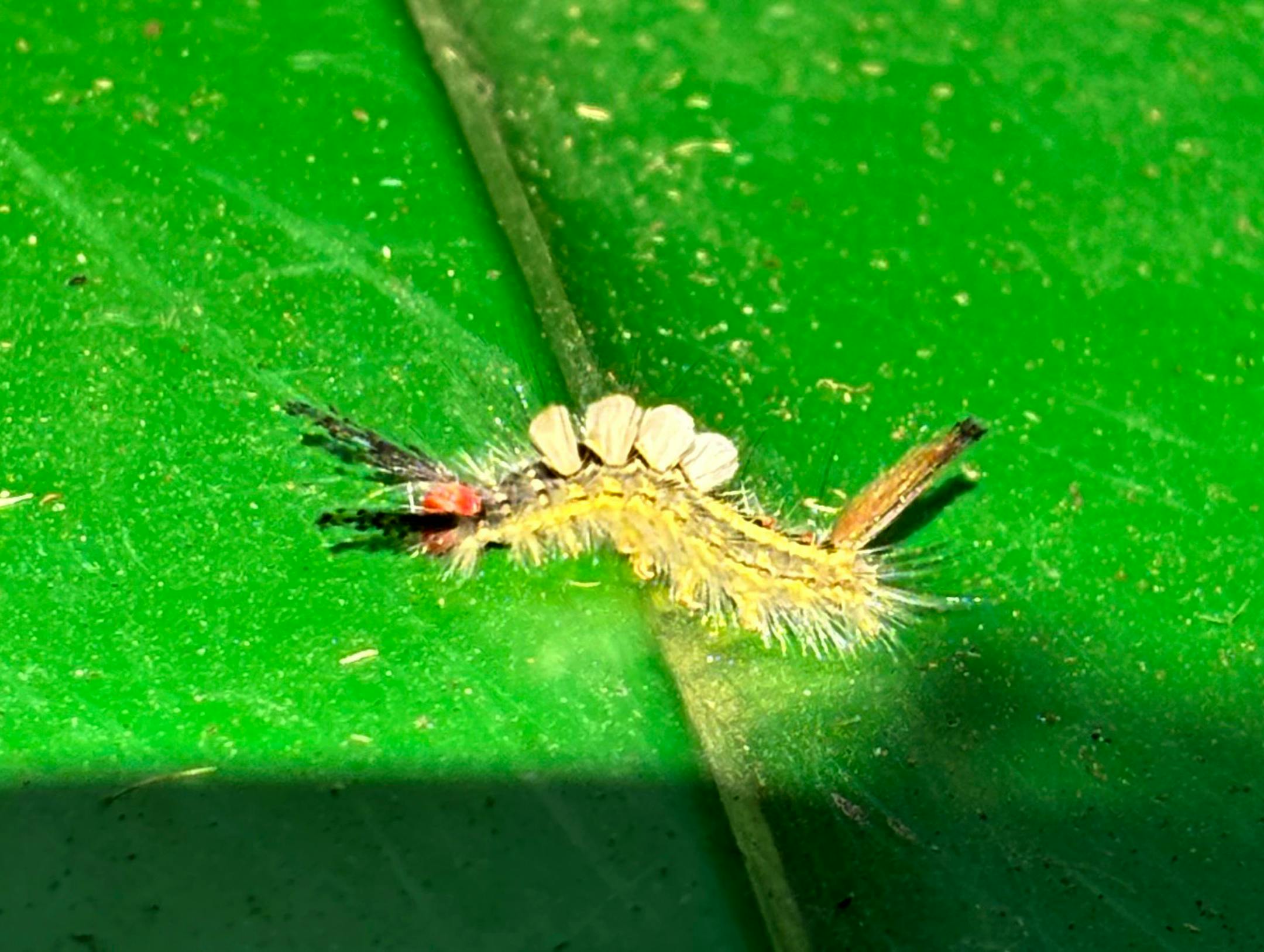 Study them closely to see the clustered hairs that resemble a bottle brush or pipe cleaner. They also sport telltale tall tufts of hair near the head and posterior. Those tufts, or tussocks, resemble rogue grasses that grow taller than everything around it.