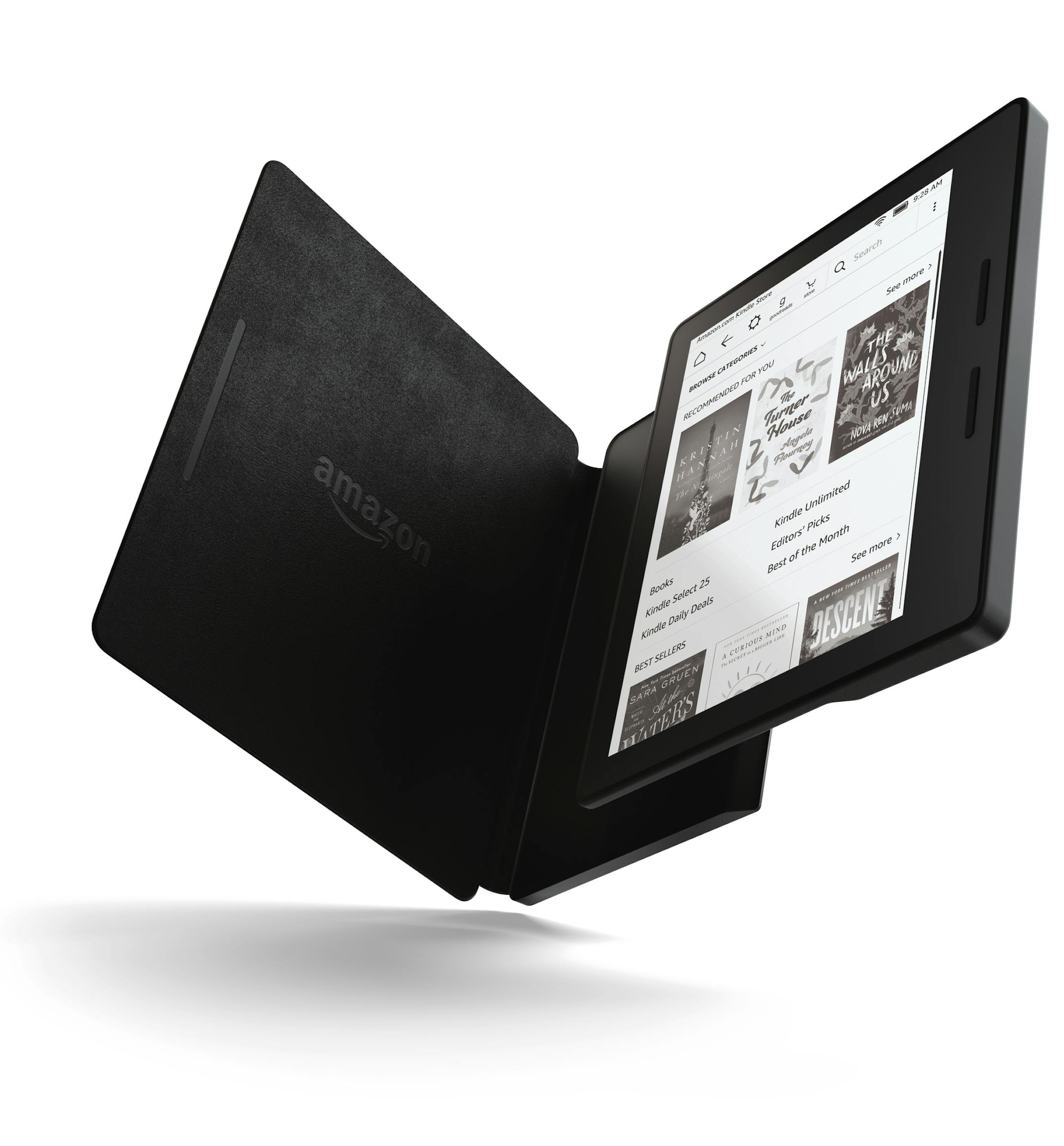 It also comes with a leather cover that opens like a book and acts like a charging case that can provide months of battery life, according to Amazon. The case — available in brown, black or burgundy — snaps magnetically to the device.