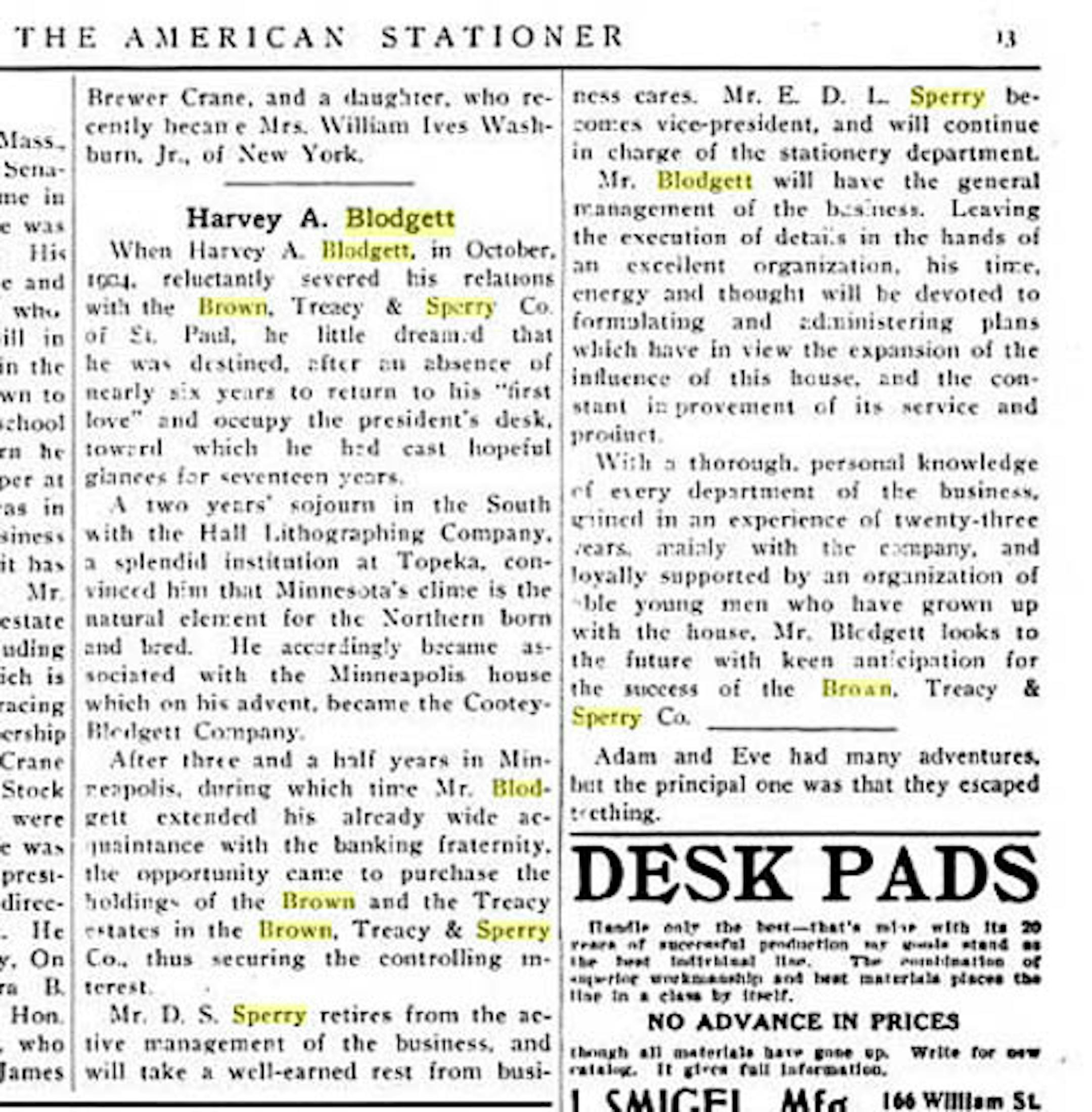Who was Brown Blodgett Sperry? I don't know. Was it the forerunner of Brown and Bigelow, the famous local pin-up calendar / playing card / promotion company? Doesn't seem so, although I admit I'm no expert in local stationery supply lore. However, the American Stationer trade publication had this to say: