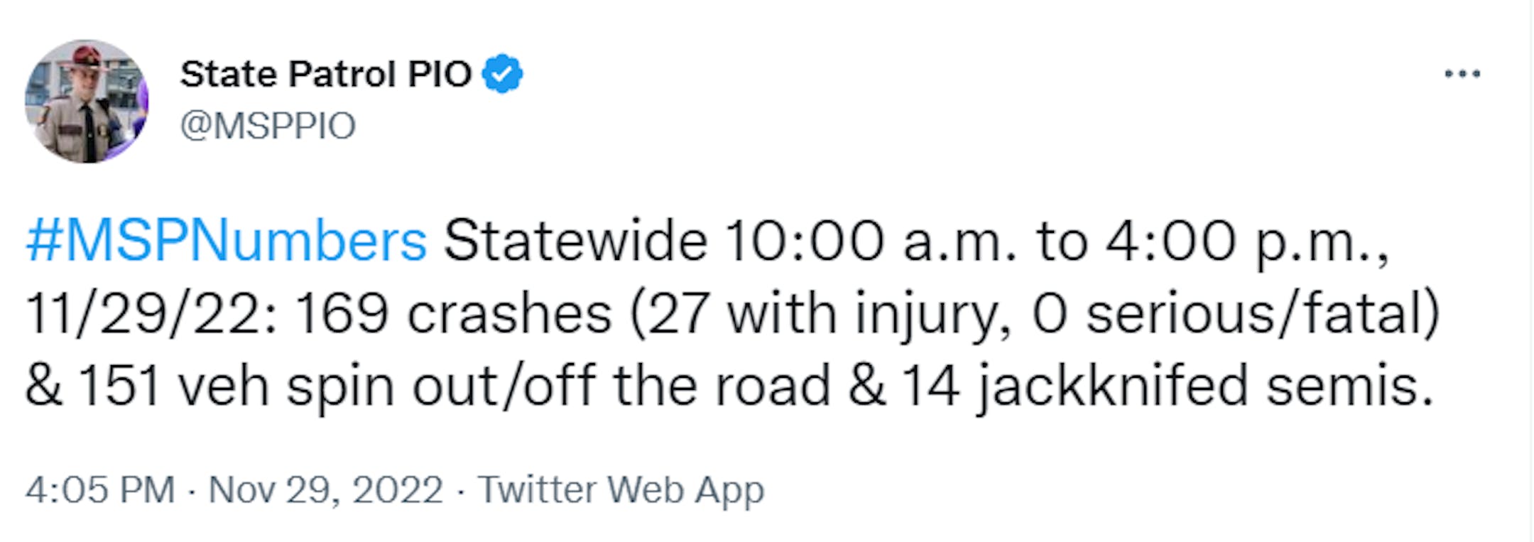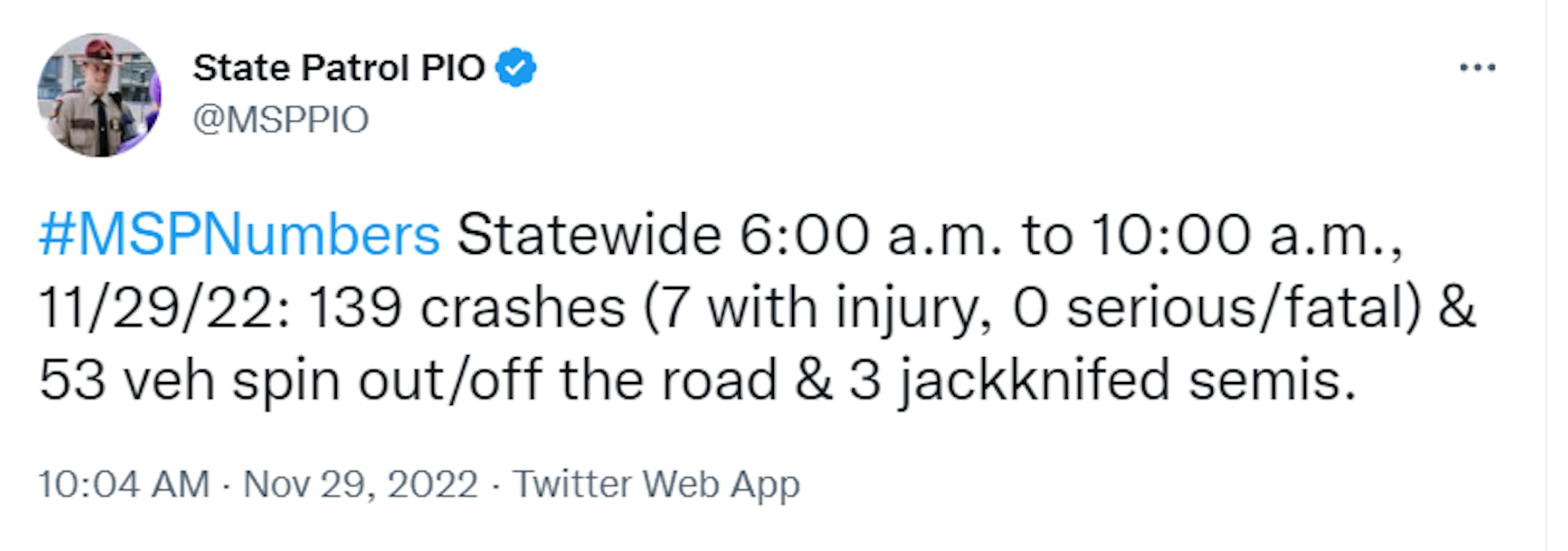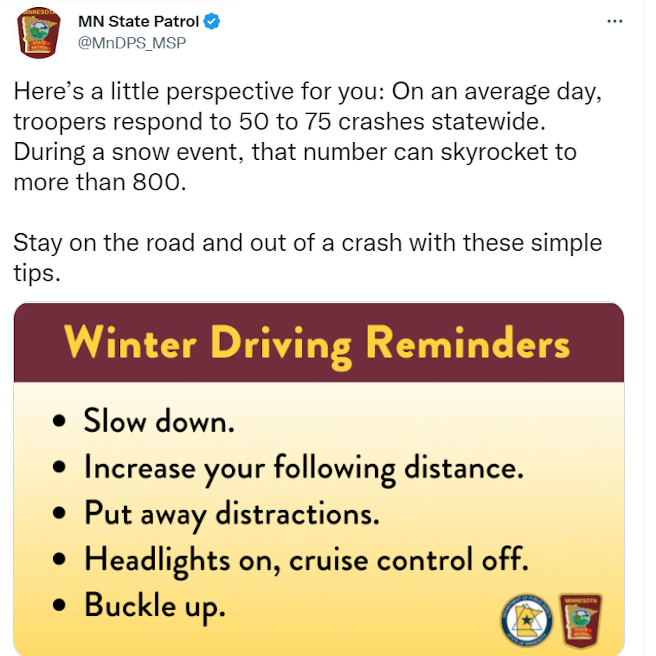 According to the Minnesota State Patrol, there were nearly 140 crashes from 6AM to 10AM Tuesday and nearly 170 crashes from 10AM to 4PM Tuesday, several of which resulted in injury. Interestingly, on an average day, the State Patrol responds to about 50 to 75 crashes statewide, but during snow days, that number can go up to 800!