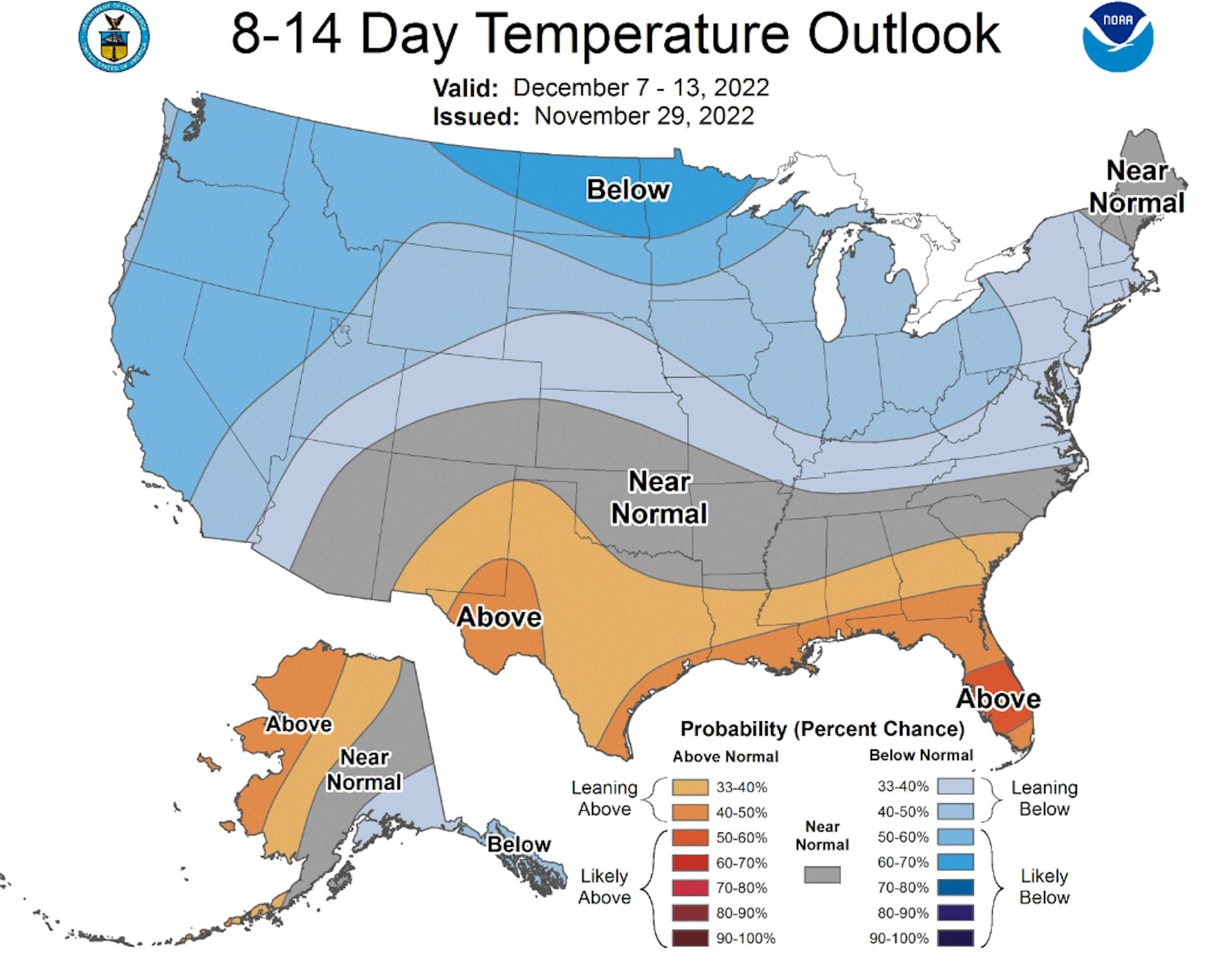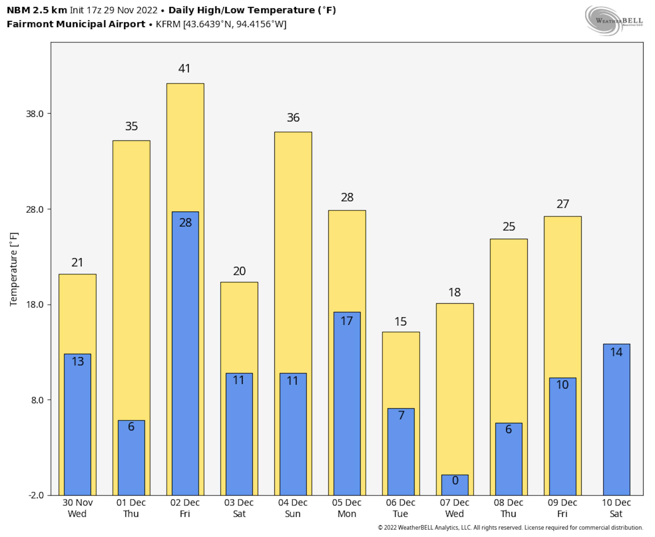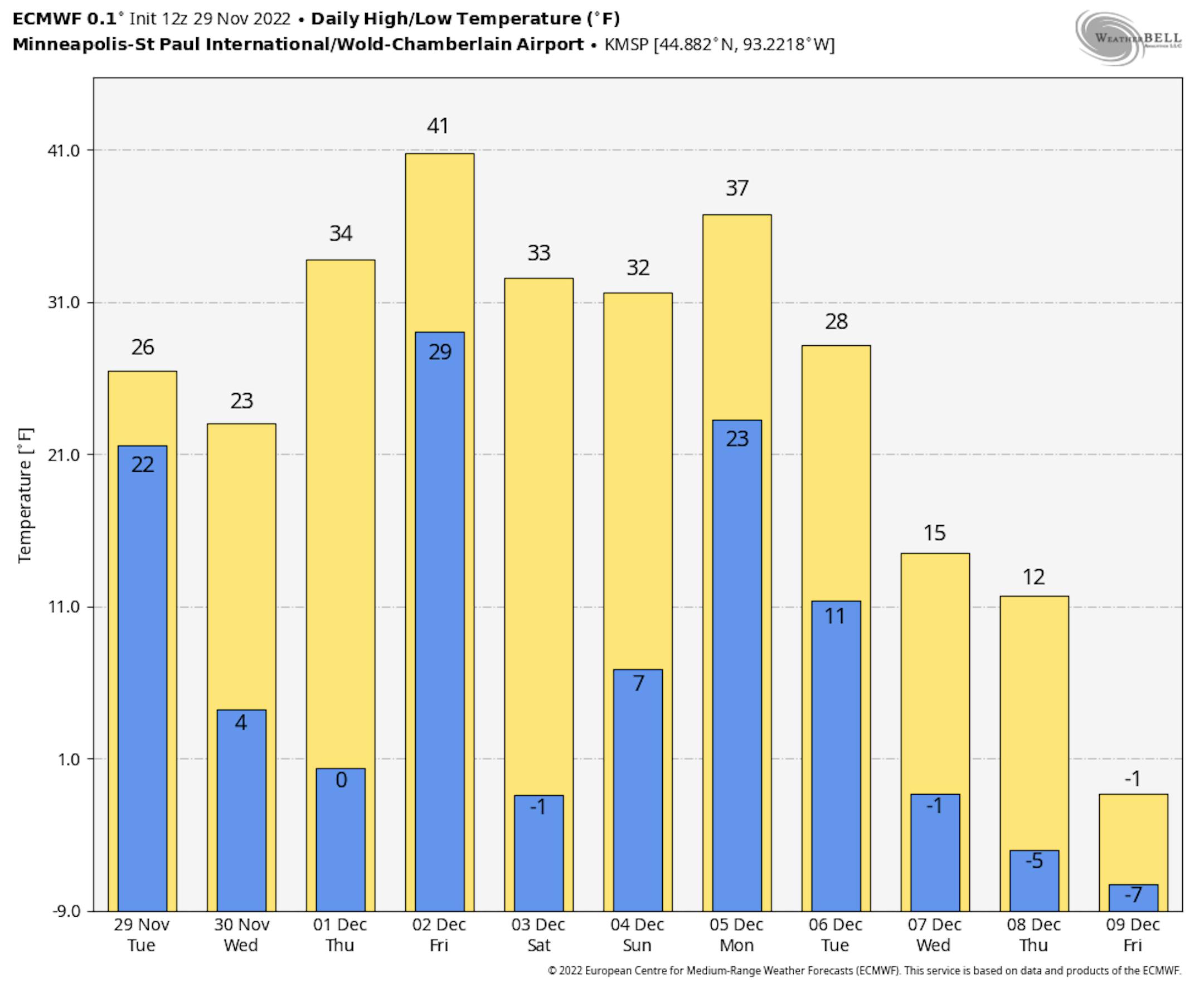 The extended temperature outlook for Minneapolis through the first week of December looks overall cooler. However, temps on Friday could warm to near 40F before some cooler air arrives over the weekend and into the first full week of December.