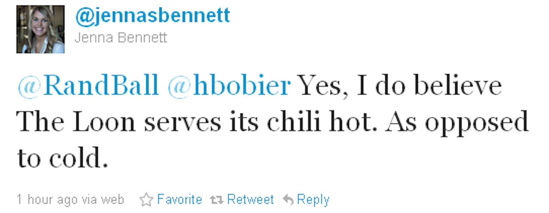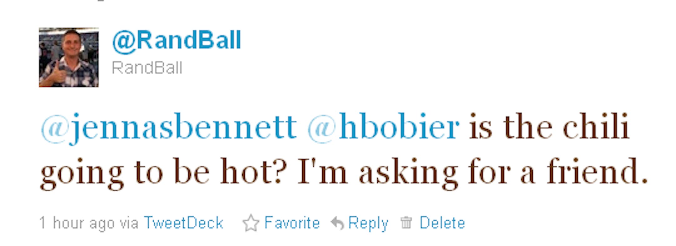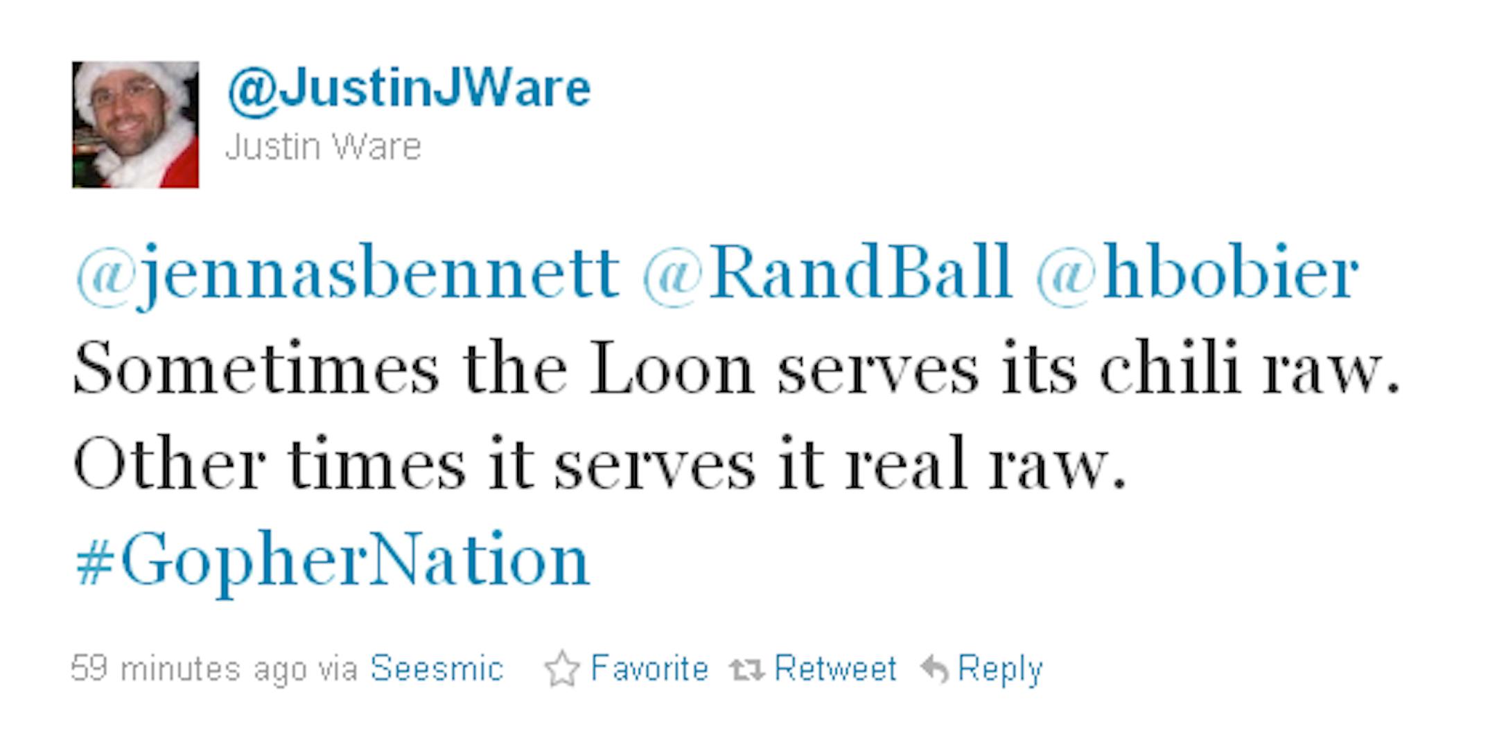 Behold a Twitter tale in seven parts. What started as a simple conversation between two young ladies discussing food -- chili, to be specific -- turned into a modern day unintentional Abbott & Costello routine that is still making us laugh. We apologize to all involved for not being able to see the word chili without thinking about ex-Gophers coach Tim Brewster. And we are sorry for not being able to leave well enough alone. Carry on with your days. Wait, but first:
