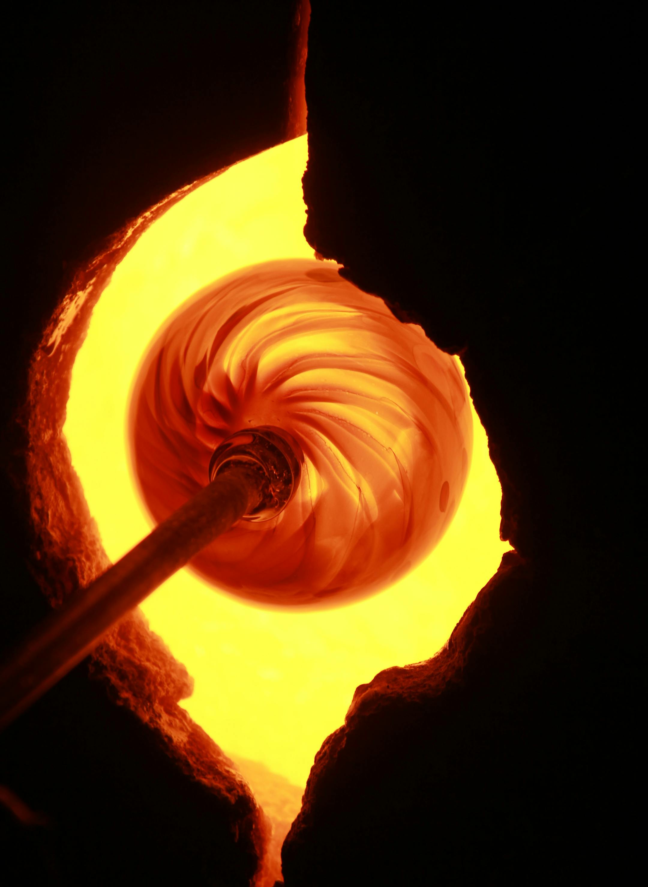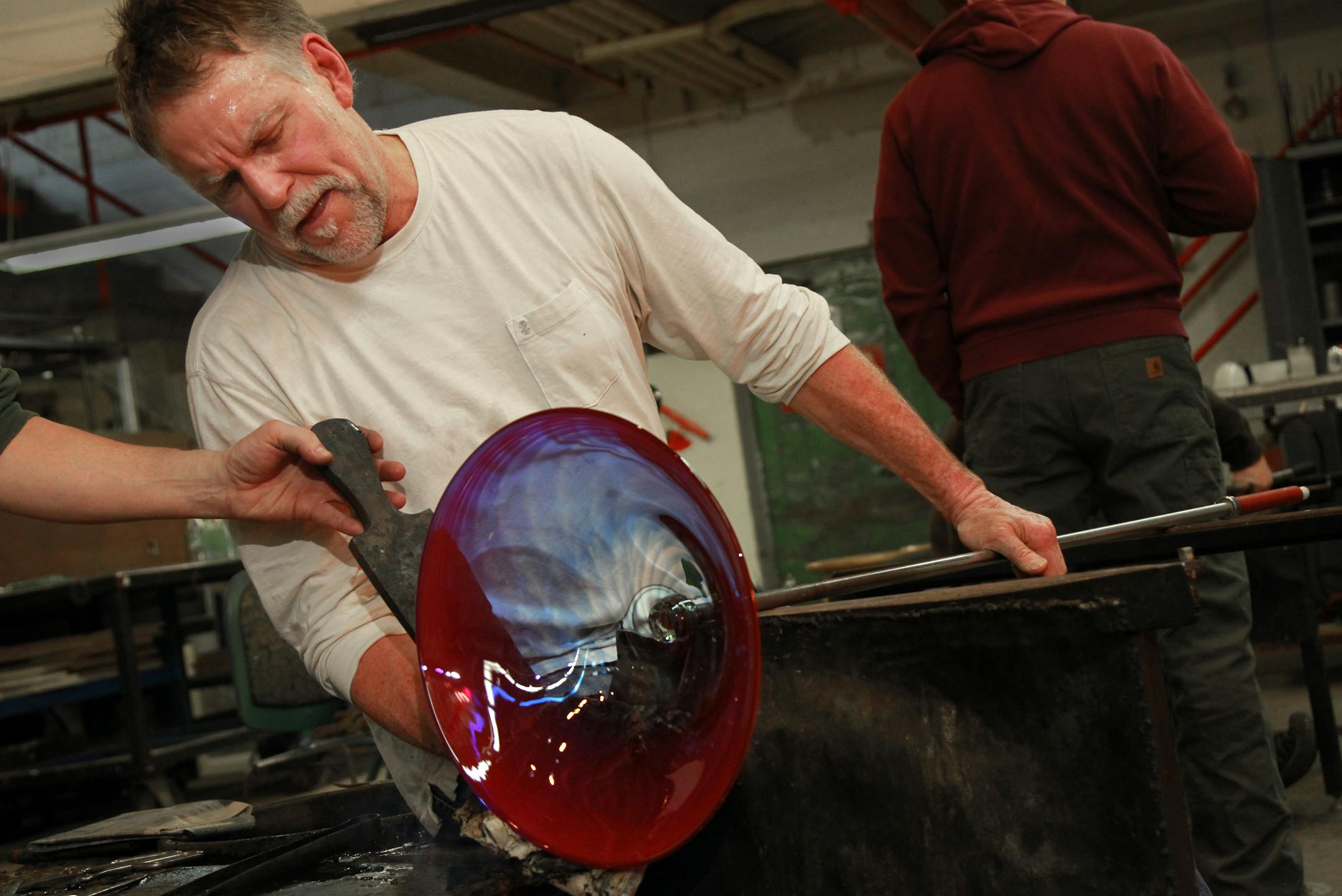 Craig Campbell is shaping the searing-hot glass, doing the last bit of work before the fiery orange shape cools into a beautiful cobalt blue vase. Suddenly it cracks off the metal pipe holding it and smashes to the floor.