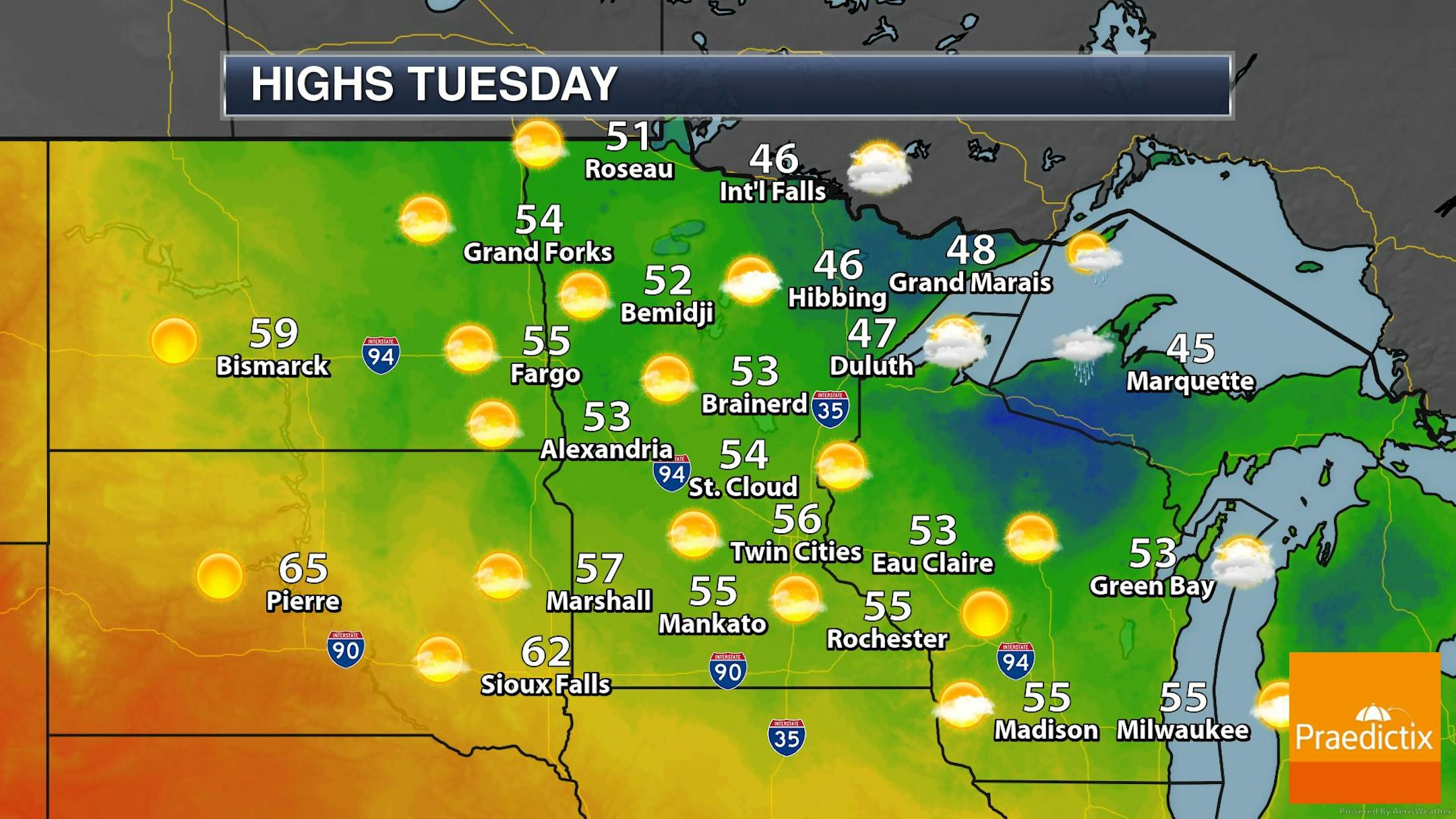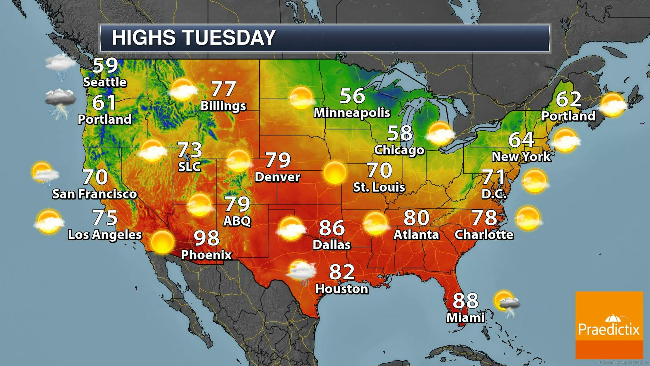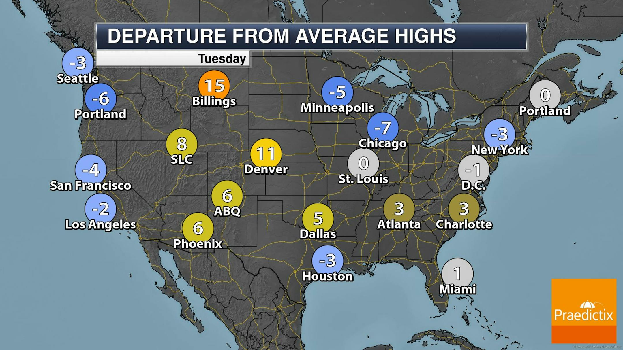 National Highs From Average on Tuesday (Praedictix/The Minnesota Star Tribune)
