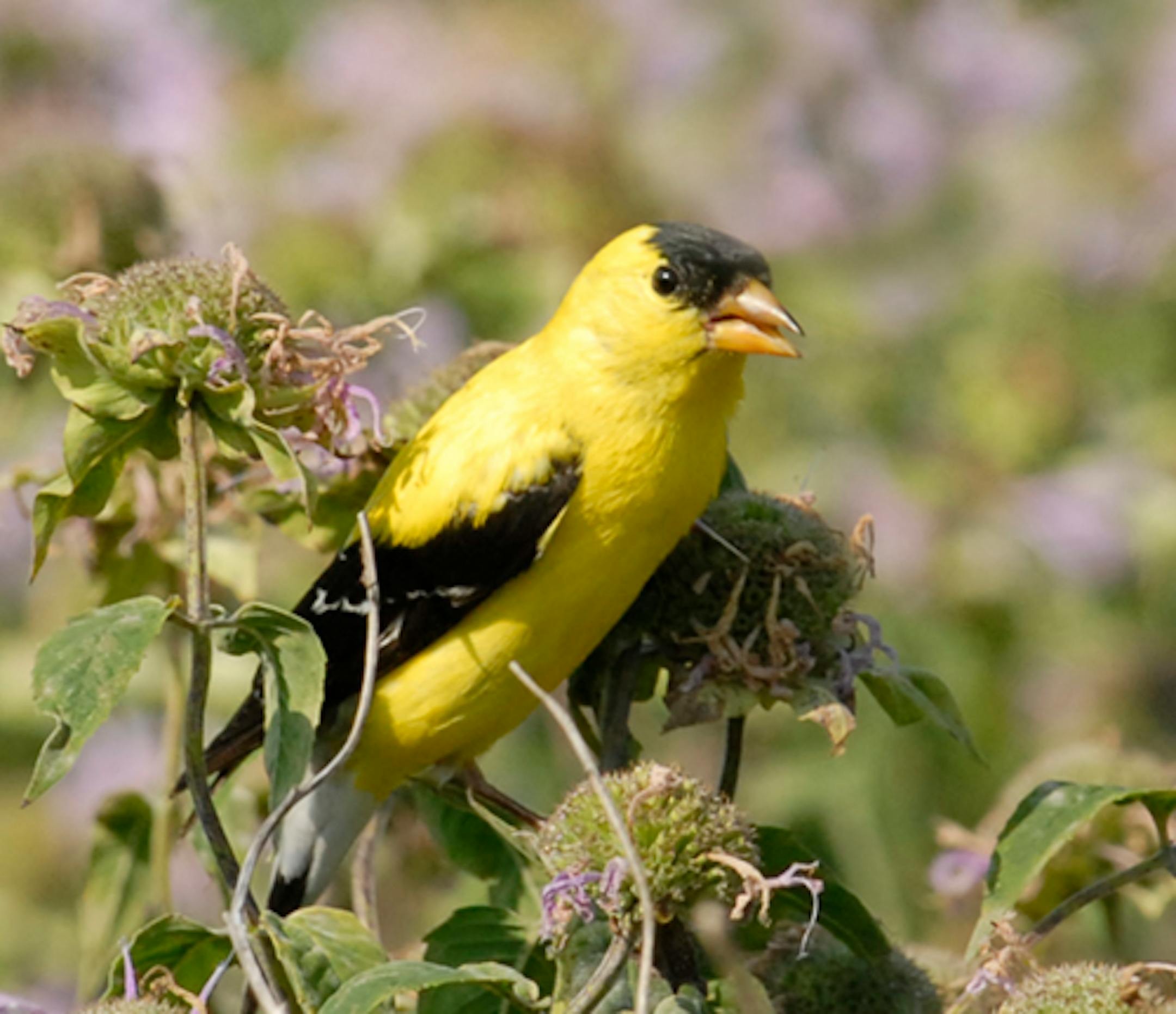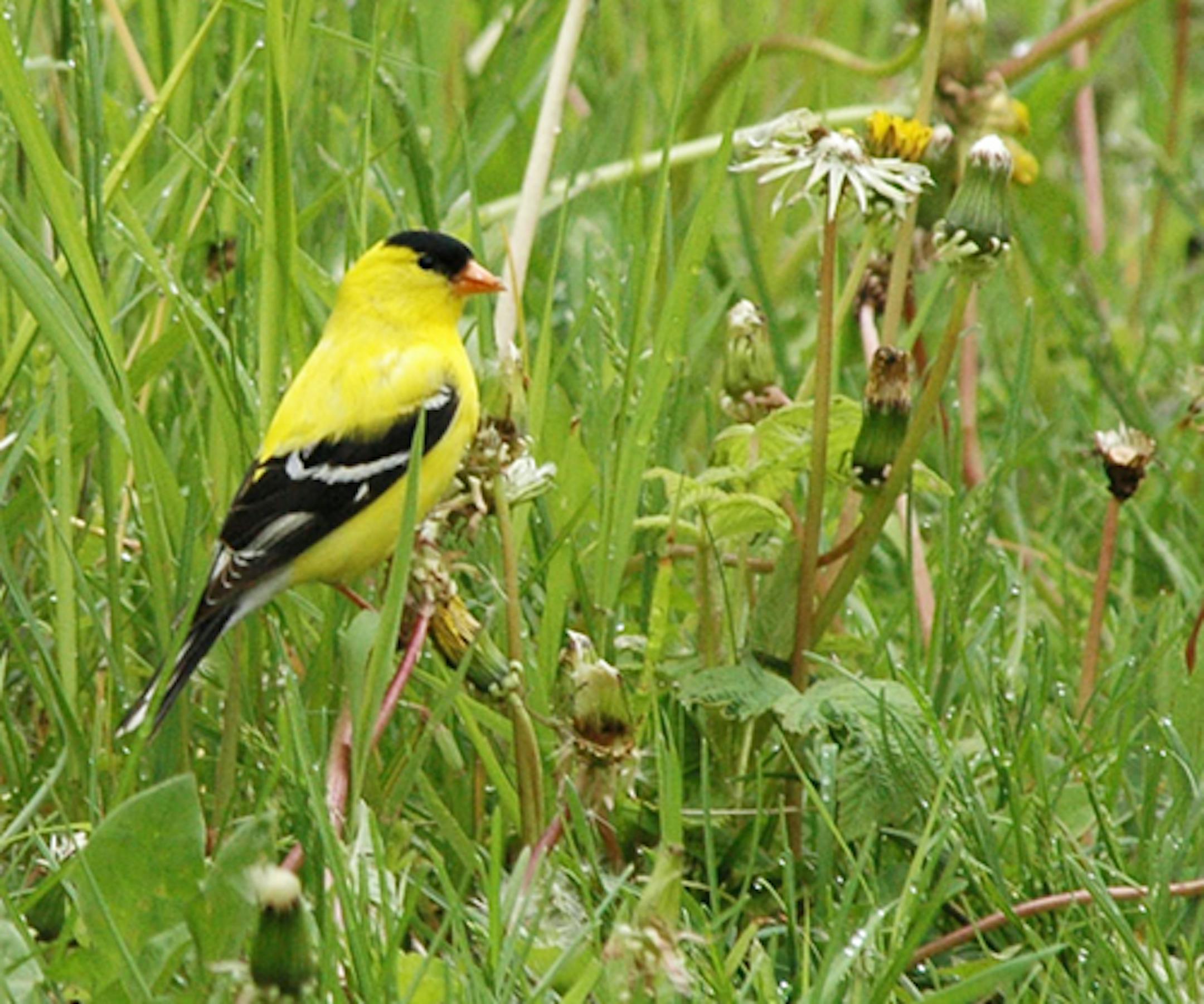 American Goldfinches, serious seed eaters, have been waiting all summer for flowers to develop seed heads from which they can feed. Gardens and weed patches are what they look for. Here, one bird is working a bergamot patch, the other dandilions. The birds are wonderful to see at feeders, better to see in a garden.