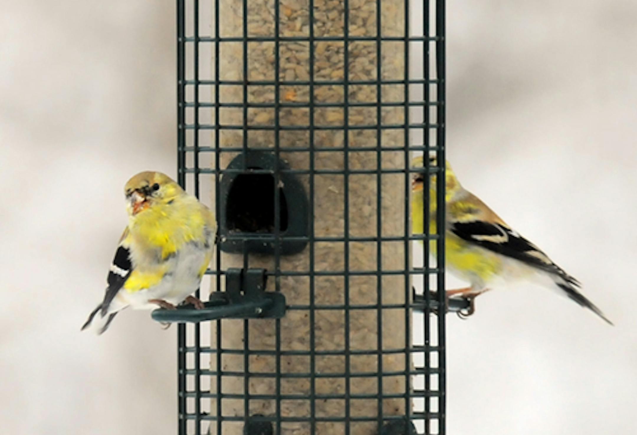 If doesn't look a lot like spring today -- Wednesday -- unless you are looking at male American Goldfinches molting from their drap winter plumage into the bright yellow of spring and summer.