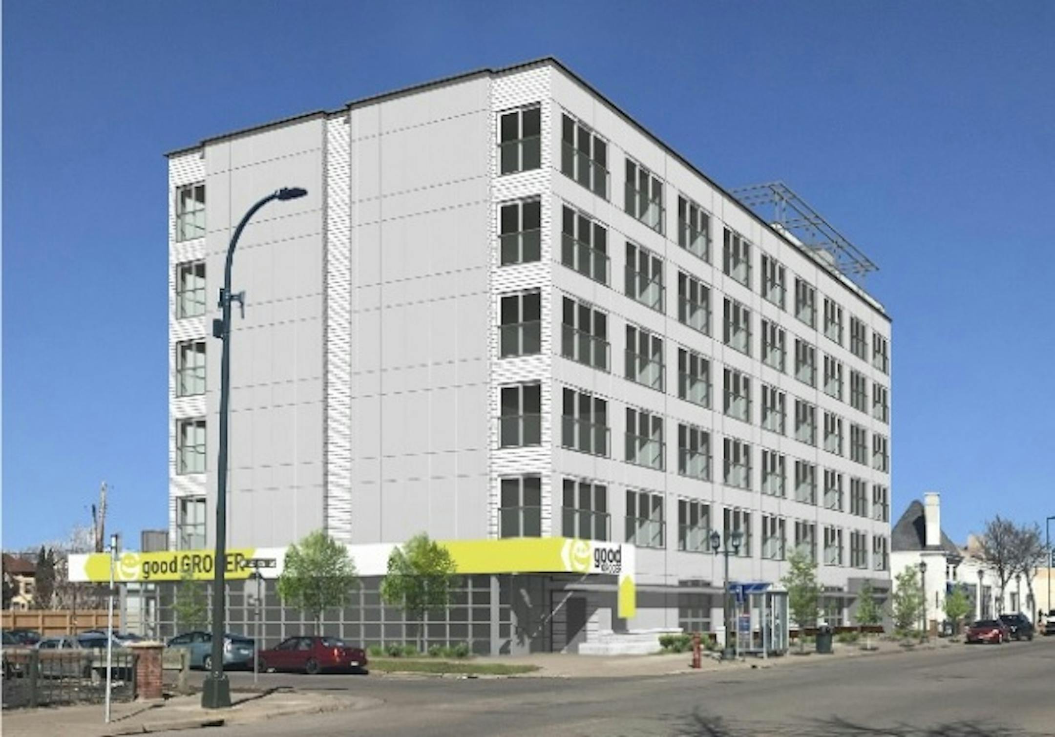 The Good Grocer proposes building a six-story building with its store on the ground floor and 80 apartments above on what's now a parking lot at Nicollet Avenue and 27th Street in Minneapolis. The design has space for 80 vehicles in a surface lot and one level of underground parking.