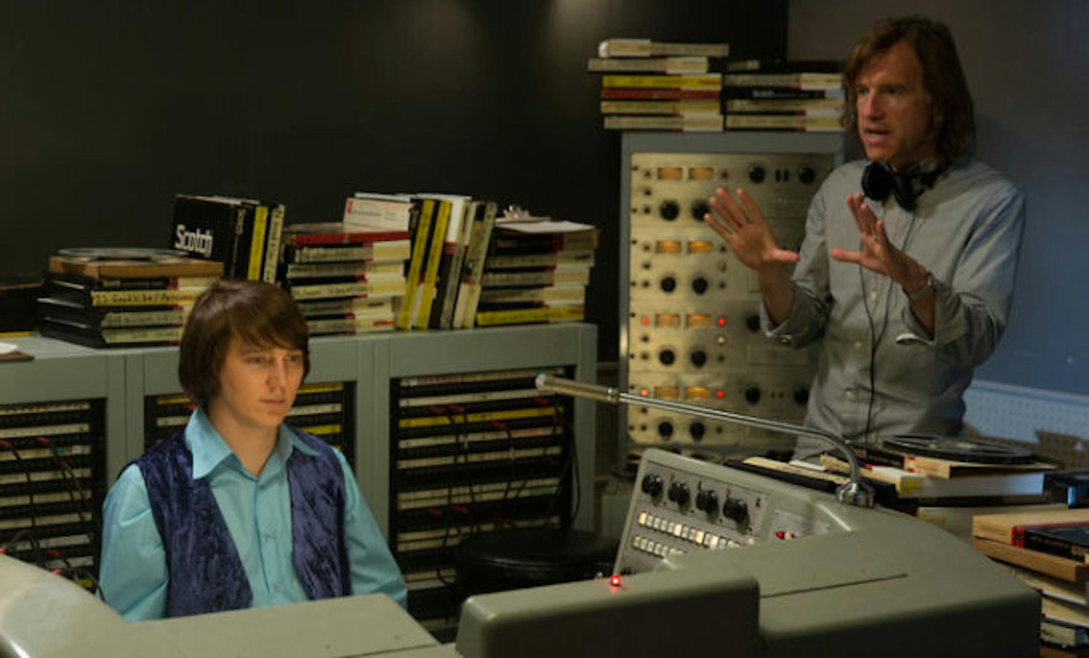 Bill Pohlad, right, directing Paul Dano in "Love & Mercy," in a scene showing Brian Wilson producing the Beach Boys' landmark "Pet Sounds" album." (photo by François Duhamel)